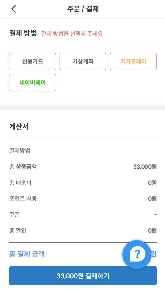 이 문제를 해결하기 위해 결제하기 버튼을 항상 활성화시키고, 결제하기 버튼을 눌렀을 때 필수 입력이 항목이 무엇인지 에러 메세지로 알려주고, 해당 항목으로 스크롤하는 기능을 개발하는 게 어떻겠냐고 기획팀과 디자인팀에게 제안했다. 주문 페이지의 디자인 변경이 주요 개발 목적이었지만, 나의 제안으로 유저에게 좀 더 친절한 결제 경험을 제공할 수 있게 되었다. 또한 기획팀, 디자인팀의 아이디어로 결제하기 버튼이 모바일 일 경우 화면 아래에 따라다니게 하여 좀 더 결제를 유도할 수 있었다.