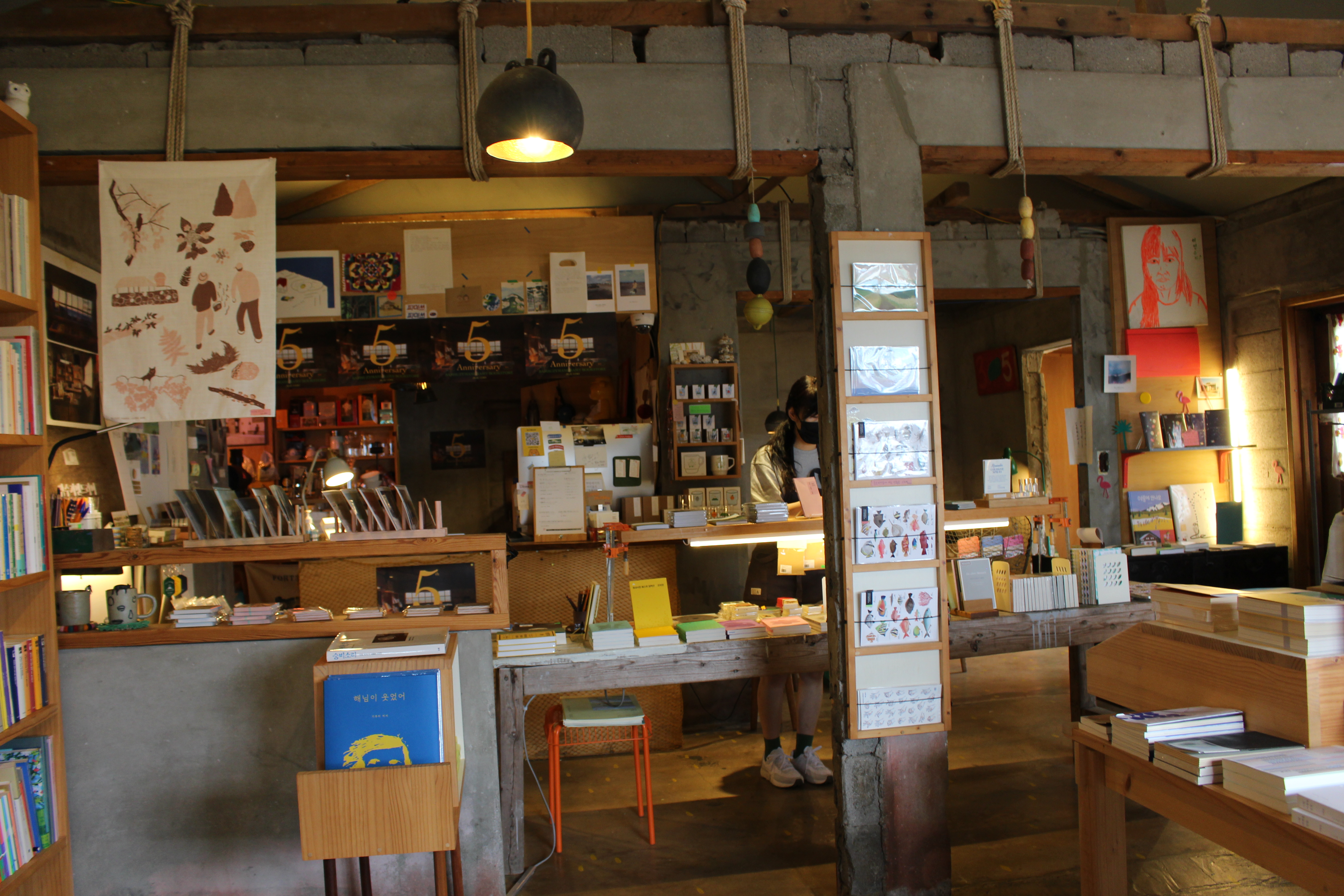 책방 내부에는 chill 한 음악이 흘러 나오는 조용한 분위기입니다. 콘크리트 벽과 나무 책장의 수많은 책들이 아늑한 분위기를 제공합니다.