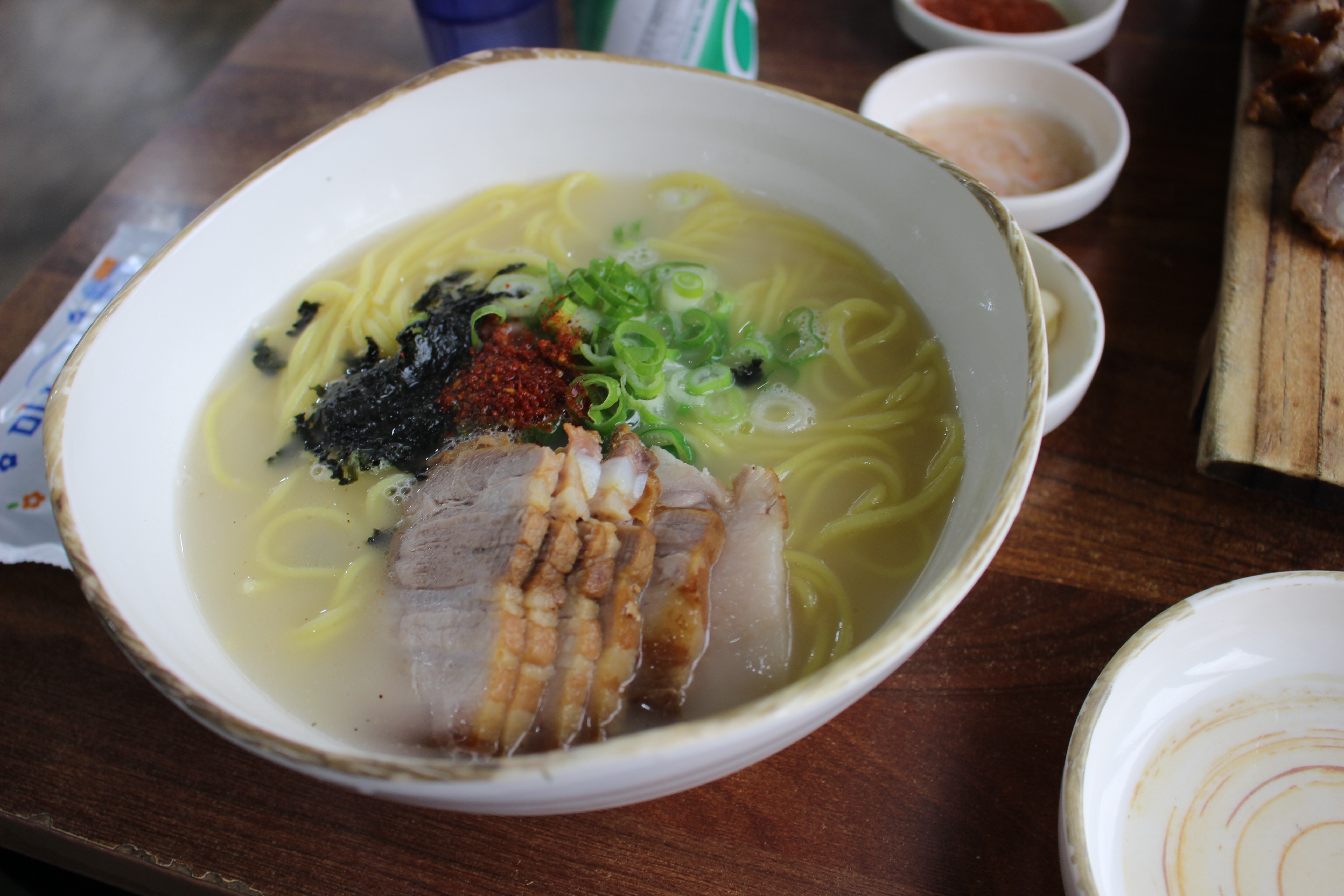 고기국수는 뽀얀 국물에 고기, 국수, 파, 양념장, 김이 있었습니다. 진한 사골 국물이 참 맛있더군요. 이정도 국물의 깊이를 만들려면 오랜 시간 동안 돼지 뼈를 우려내야 할 것 같습니다. 정성이 느껴지는 맛이었어요.
