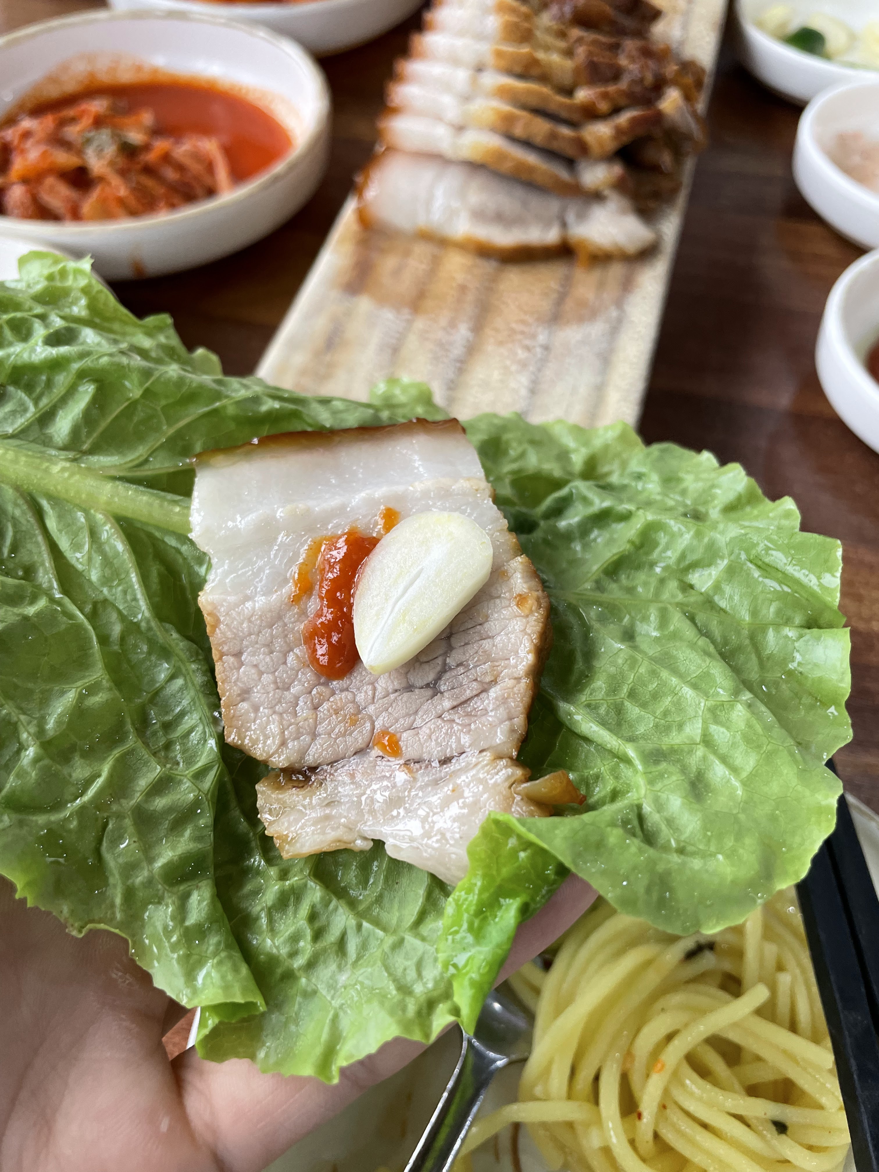 돔베고기도 야들야들해서 참 맛있었습니다. 적당한 기름이 있었는데 저는 고기에 기름이 있는 게 맛있더라고요. 살이 많이 찌긴 하겠지만 ㅎㅎ 양념장과 새우젓에 상추쌈을 싸 먹으면 최고였습니다.