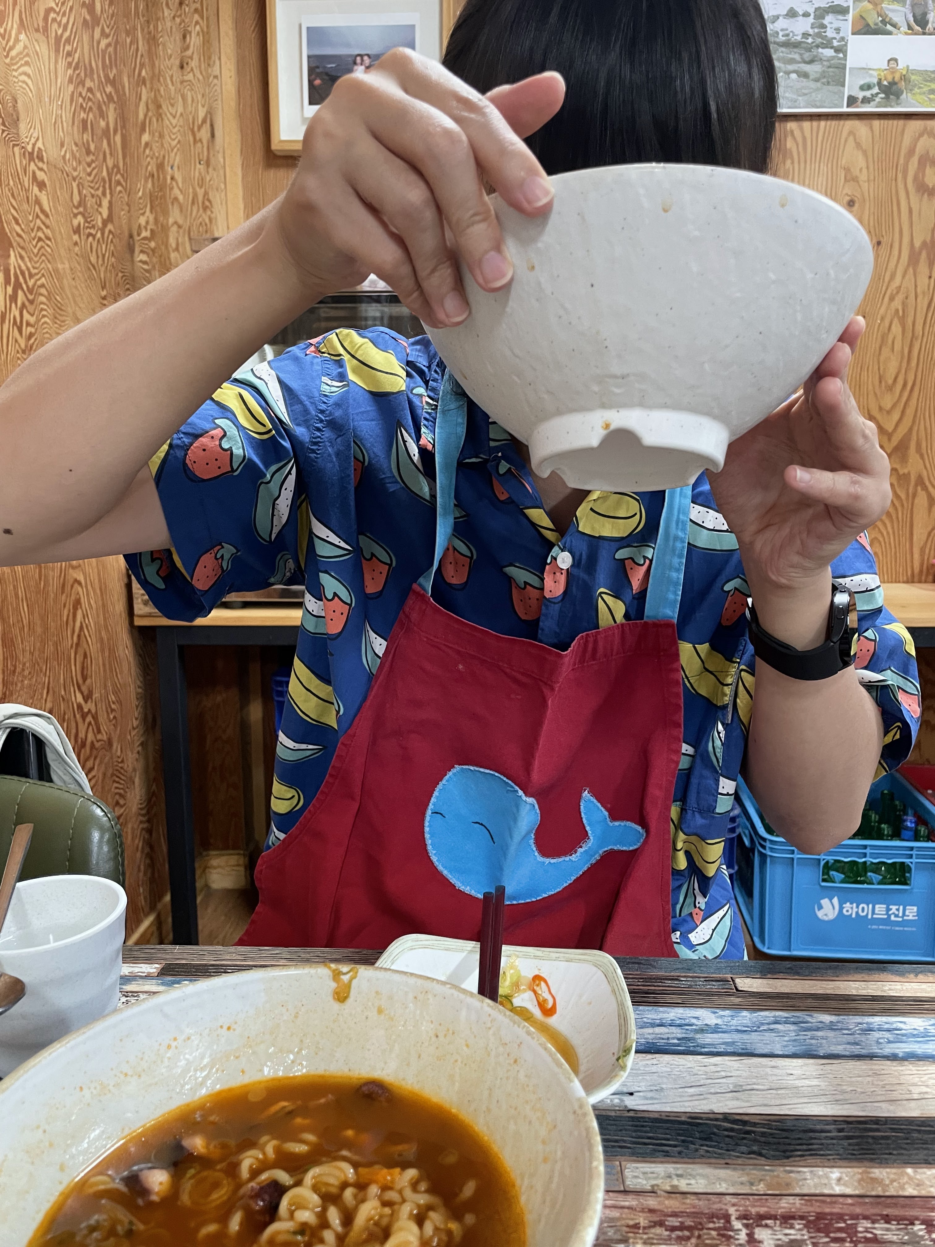고래 그림이 그려져 있는 앞치마가 귀엽죠?ㅋㅋ