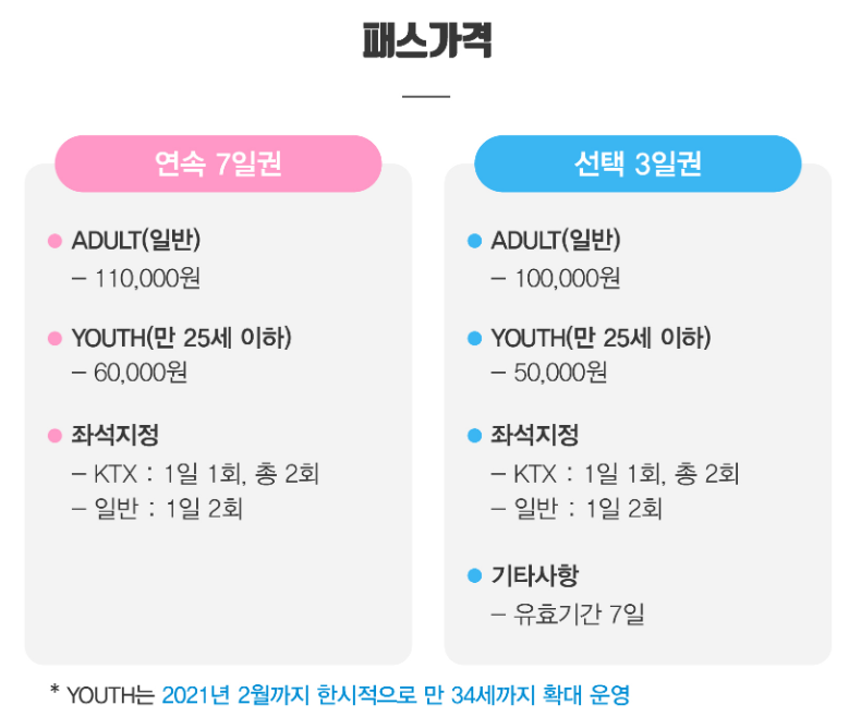 선택 3일권으로 KTX 2회만 탑승해도 서울 부산 KTX 왕복을 반값에 다녀올 수 있습니다. 게다가 일반 열차까지 한 번 더 이용한다면 가격은 훨씬 이득입니다. 주목해야 할 문구는 "YOUTH는 2021년 2월까지 한시적으로 만 34세까지 확대 운영"입니다. 내일로 YOUTH가 만 25세 이하까지인데 9살이나 추가적으로 늘린 것입니다. 그만큼 철도 운수 업계가 얼마나 힘든지 알 수 있는 대목입니다. 그리고 유효 기간은 7일이라서 7일 이내에 3일을 써야 합니다.