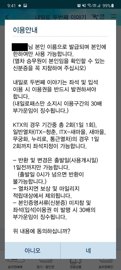 3. 내일로는 개시일 하루 전까지 수수료 400원을 내고 취소 가능합니다. 따라서 내일로를 구매하고 잔여 좌석이 없다면 400원을 내고 취소하시면 됩니다. 잔여 좌석이 있다면 KTX 요금 반값 이상을 아낄 수 있으니 400원은 아깝지 않은 것 같습니다.