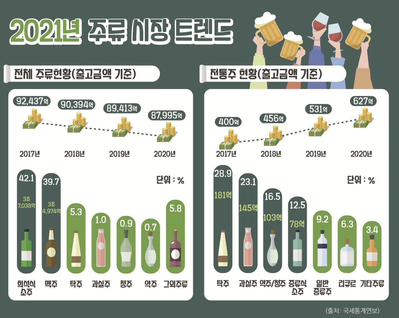 주류 시장에서 전통주가 차지하는 규모가 아직 작다. 2021년에는 전통주가 전체 주류 시장의 1%를 넘기지 못했다.