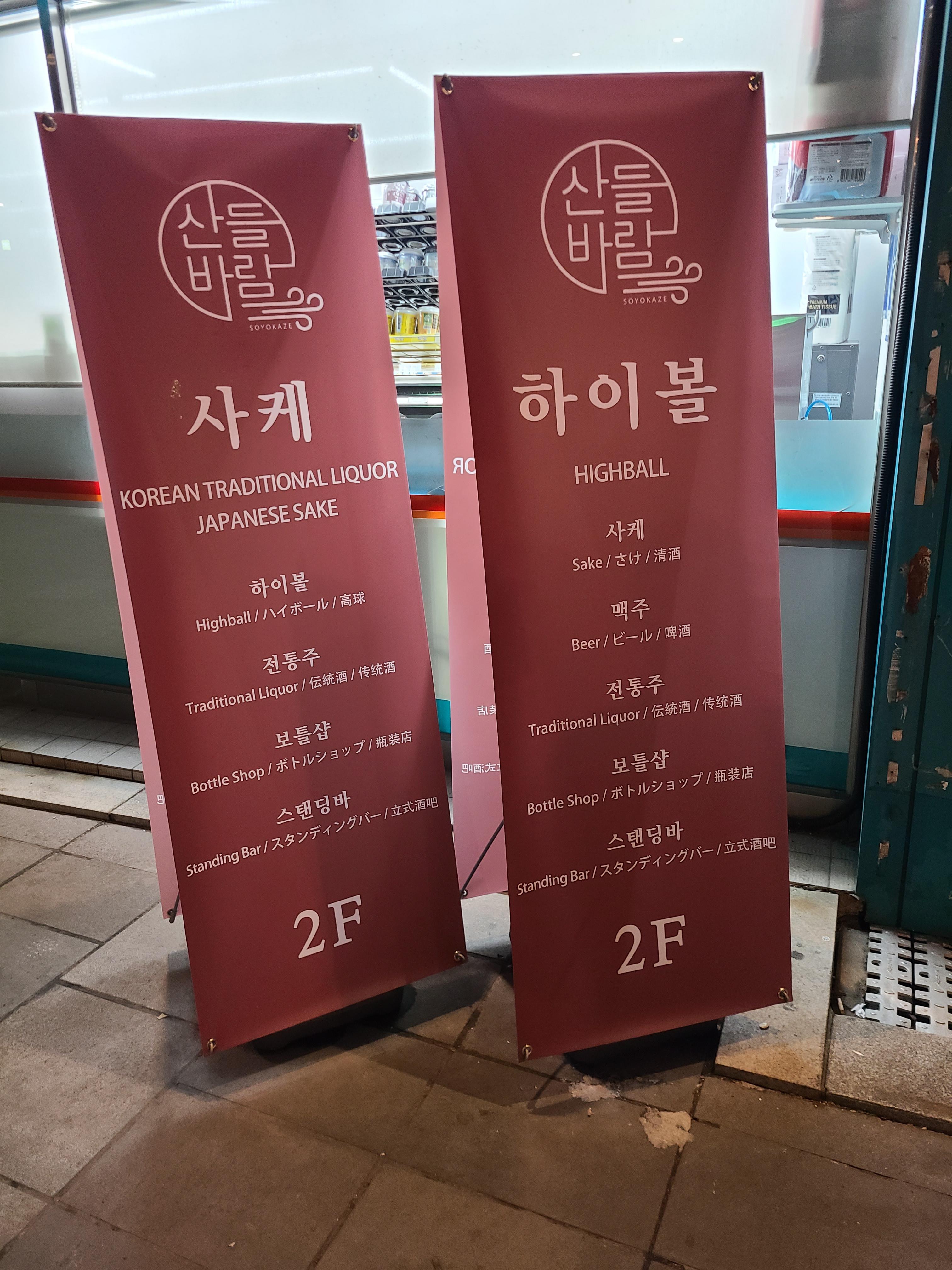 사케, 하이볼, 전통주, 맥주, 보틀샵, 스탠딩바가 적혀있는 입간판이 가게 앞에 있습니다.