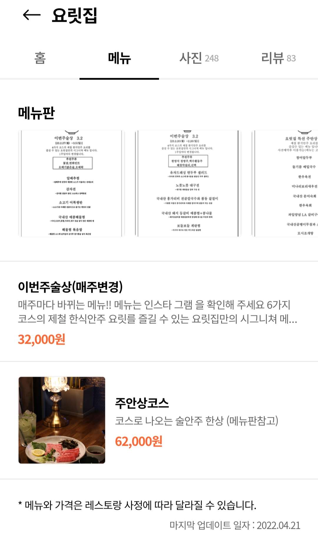 메뉴에 대해 자세히 설명돼있으니 참고하셔서 예약하세요~!