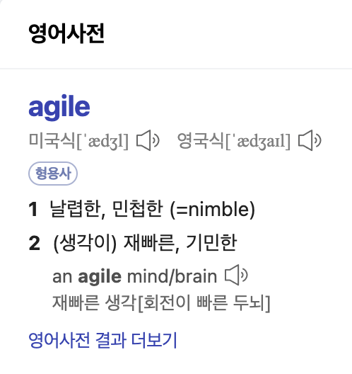 애자일이란 영어 단어 agile에서 가져온 단어로 (당연히 한글 아니잖아) 날렵한, 민첩한 이란 뜻을 가지고 있다.