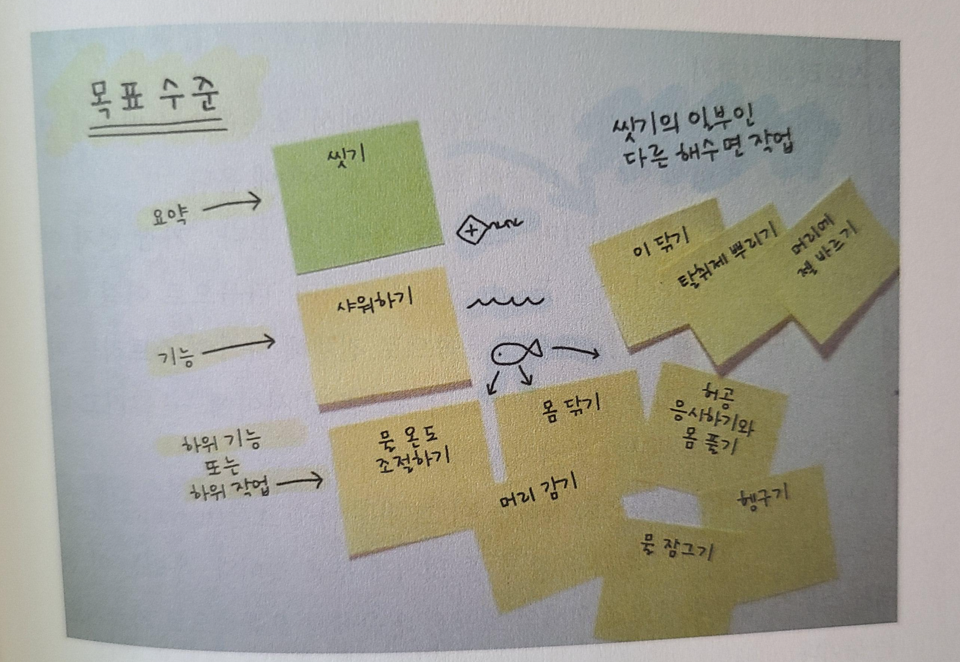 "샤워하기" 의 하위로 "물 온도 조절하기", "머리 감기" 등 더 자세히 정리해 볼 수도 있다.