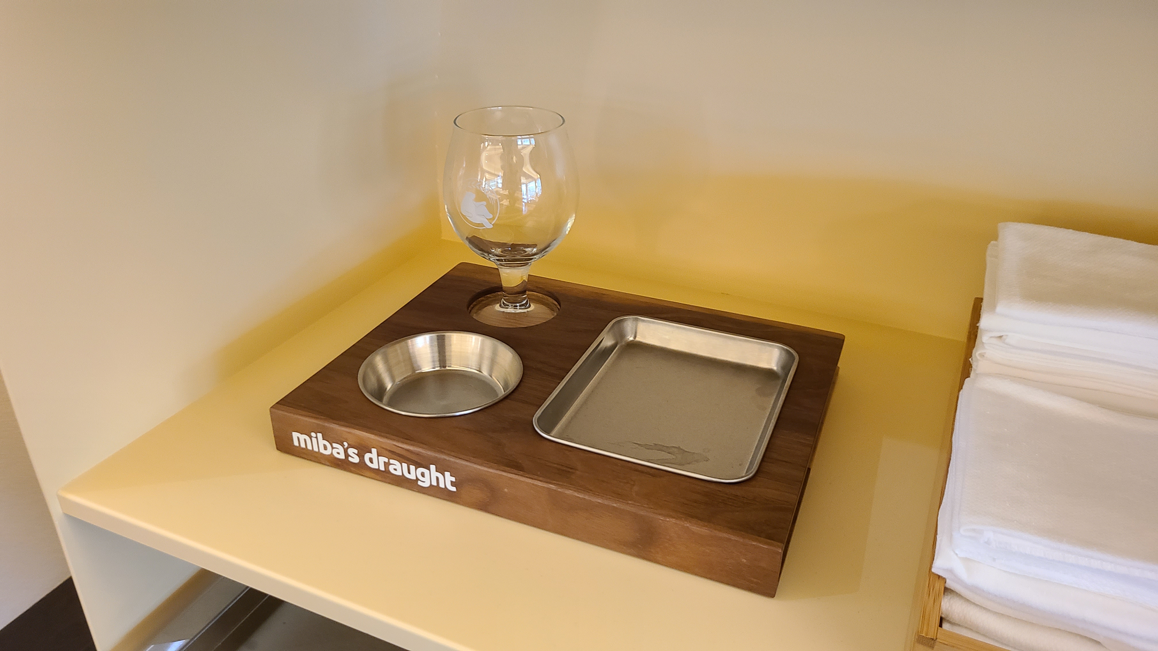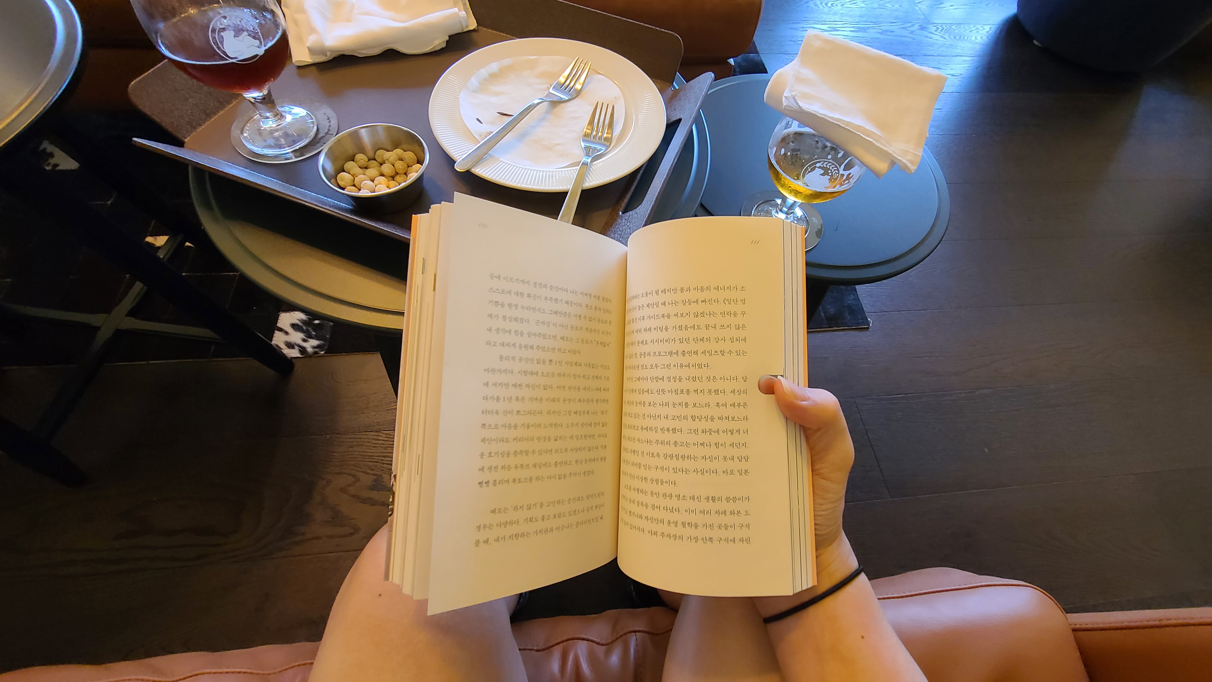 위의 맥주 받침대는 실용적이면서도 재밌었어요. 첫째로 맥주잔과 안주 그릇을 고정시키고 있기 때문에 받침대를 들고 이동할 때 미끄러지지 않아 안전했어요. (심지어 받침대 옆에 들기 편하도록 손가락이 들어갈 수 있는 공간도 있었어요) 둘째로 나중에 맥주를 마시다 알게 되었지만 저 받침대가 책의 모양을 하고 있더라고요! 책을 기증받고 읽을 수 있는 공간 컨셉에 맞춘 받침대였어요.