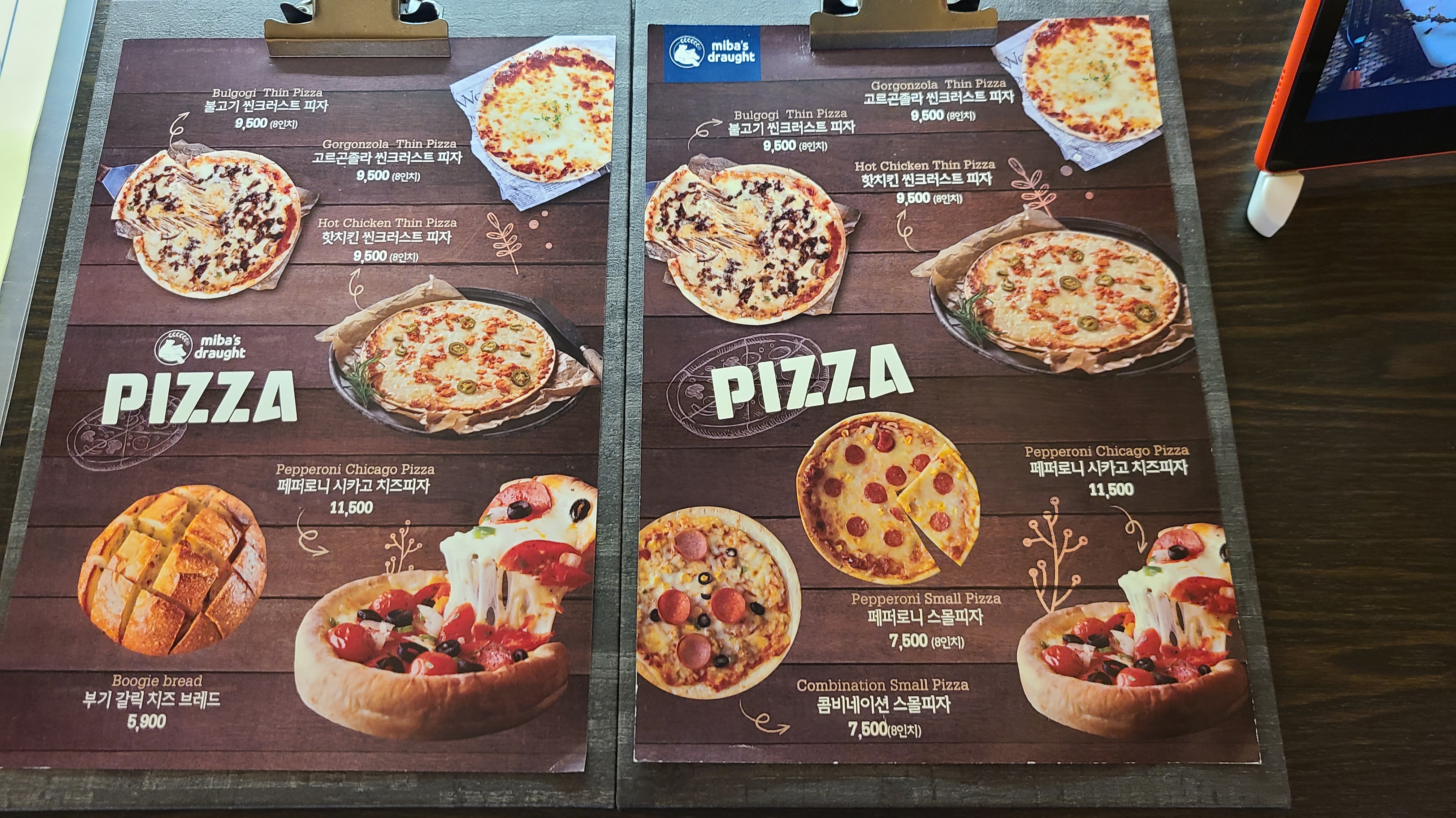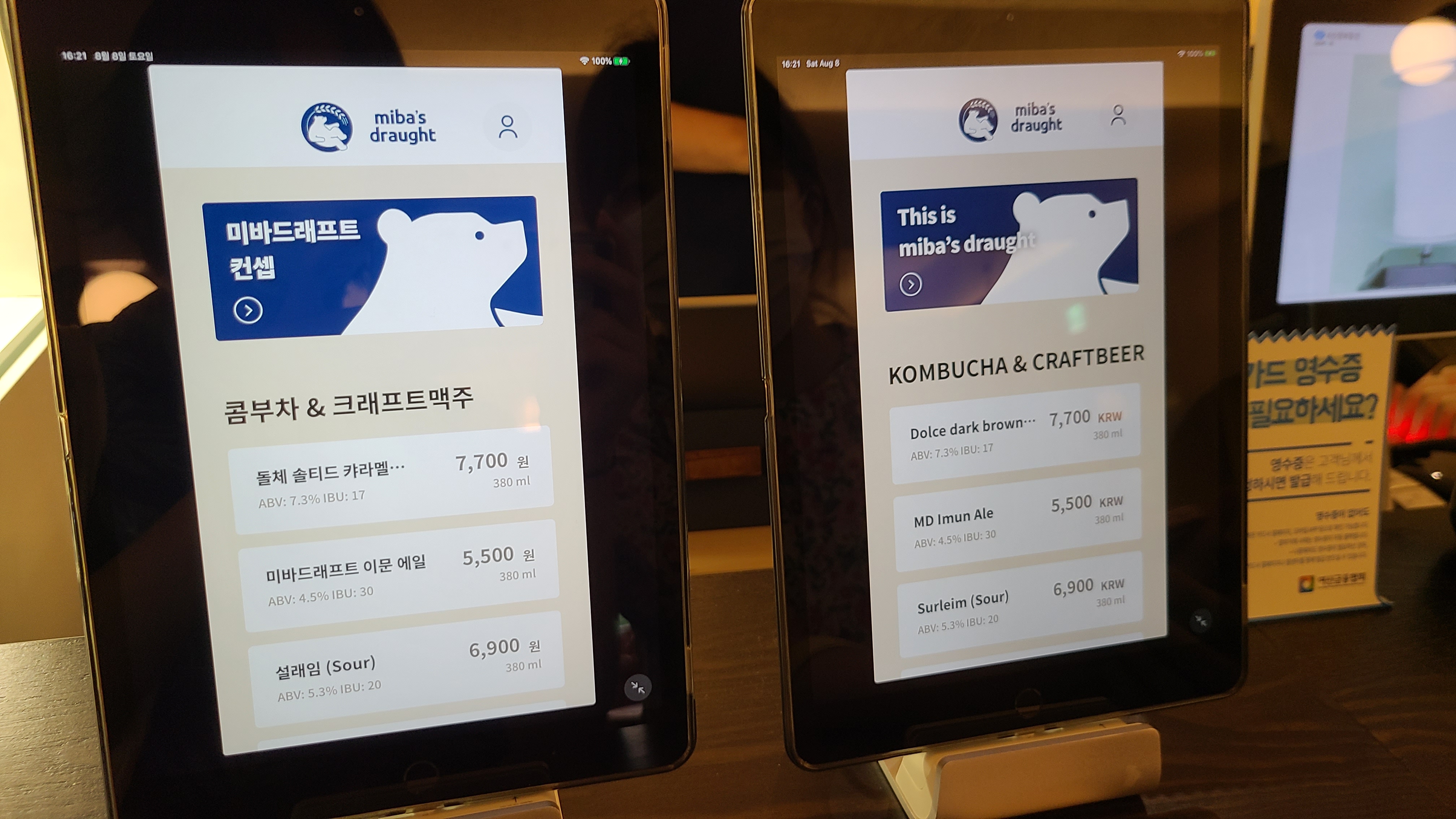 메뉴판은 두 대의 태블릿으로 볼 수 있었는데요, 한국어와 영어가 함께 있었습니다. 외국 손님들까지 배려한 모습이 좋았어요. 메뉴판은 미바 드래프트 앱을 보여주는 것이었어요. 구글 플레이 스토어와 애플 스토어 모두 미바 드래프트 앱이 있었어요. 앱에 들어가면 재밌는 정보들이 많았는데요, 글 마지막에 다시 소개해보겠습니다.