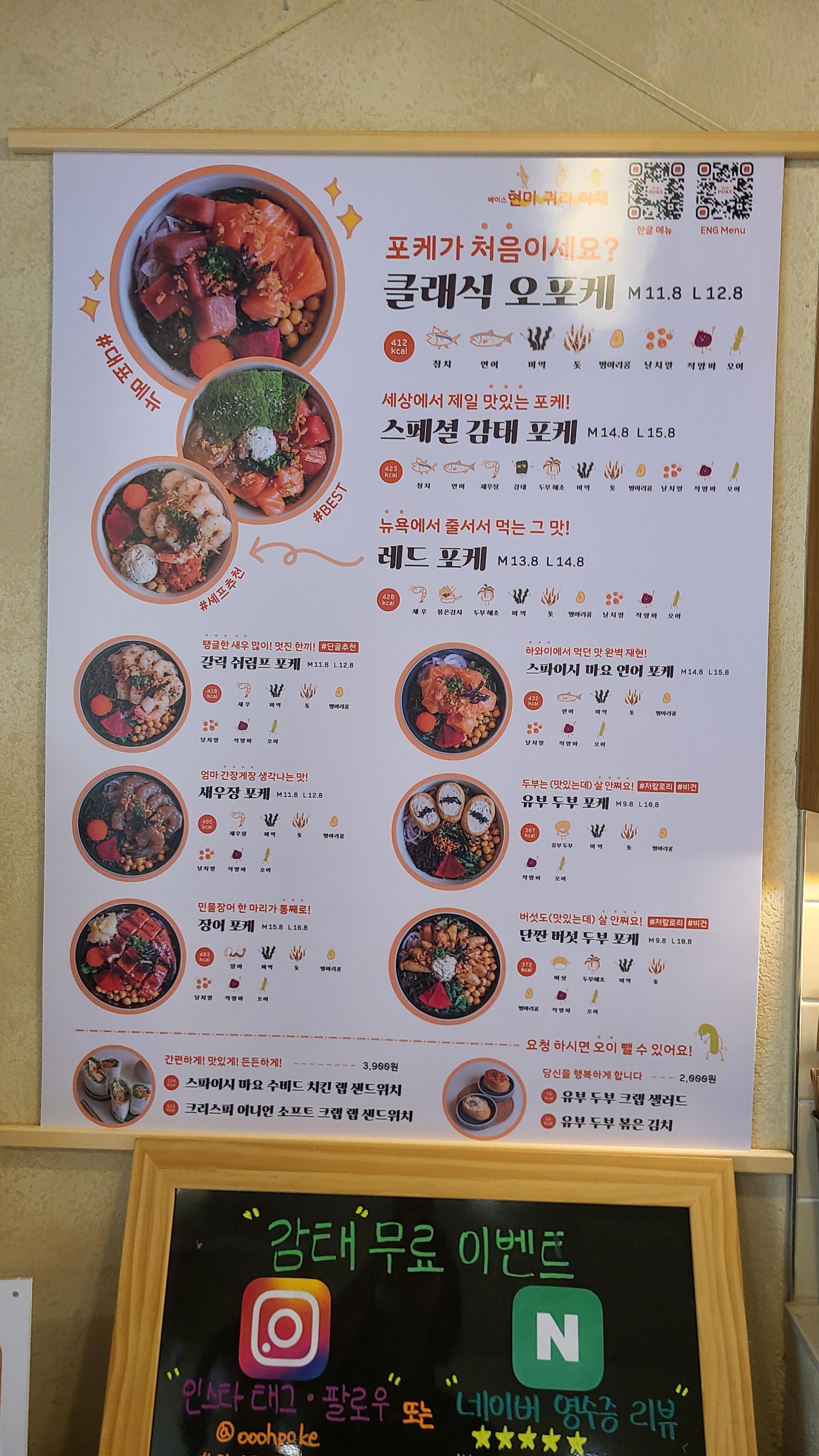 메뉴는 클래식 오포케, 스페셜 감태 포케, 레드 포케, 갈릭 쉬림프, 새우장, 장어, 스파이시 마요 연어. 유부 두부, 단짠 버섯 두부 포케가 있었어요. 어떤 재료가 들어가는지, 맛은 어떤 지, 추천 메뉴는 무엇인지, 가격은 얼마인지, 특징은 무엇인지, 음식은 어떻게 생겼는지 설명이 너무 잘 되어 있었어요!