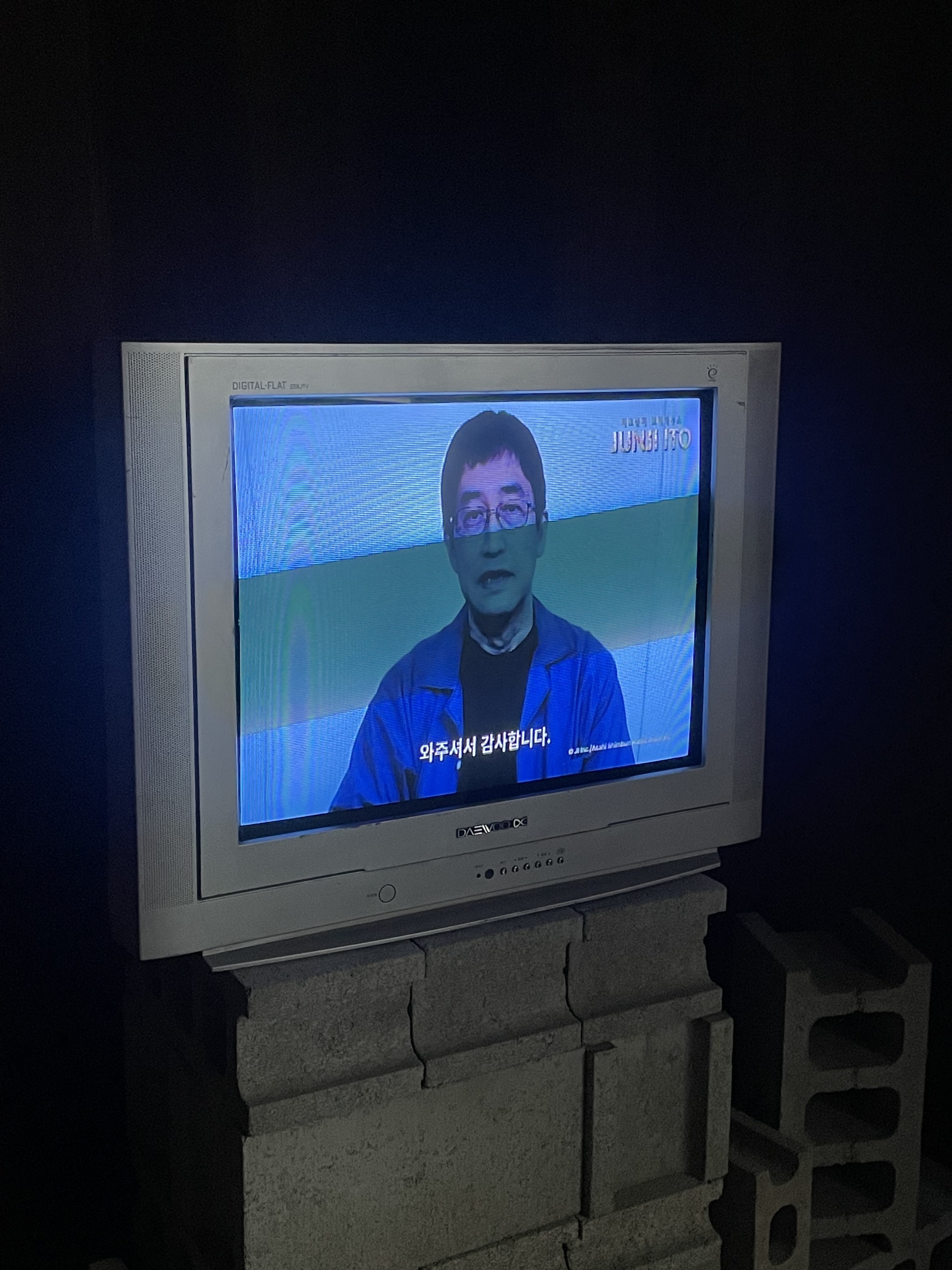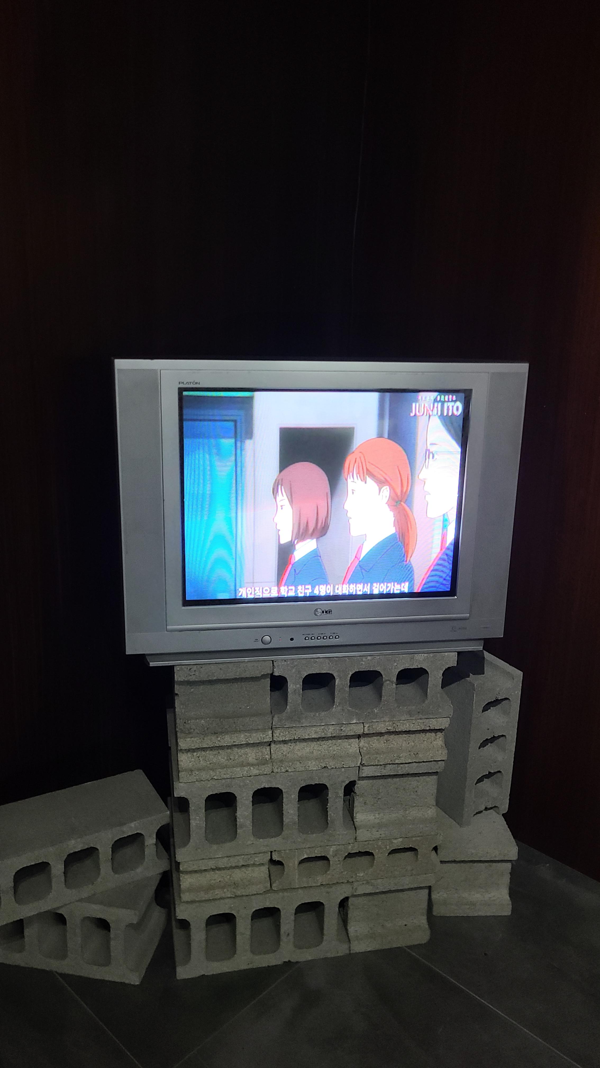 이토준지 작가님의 인터뷰는 벽돌 위에 오래된 티비로 틀어져 있었다.