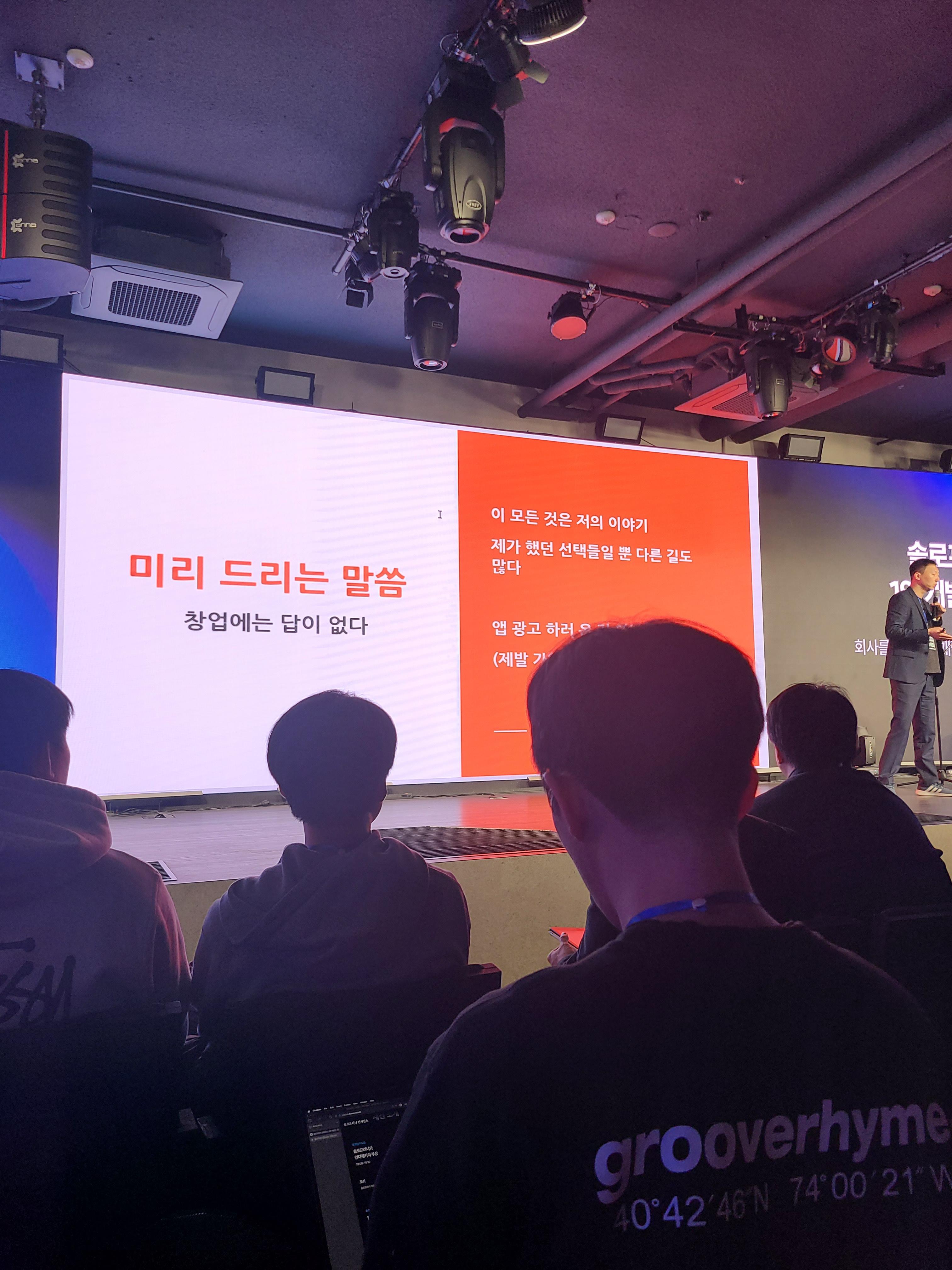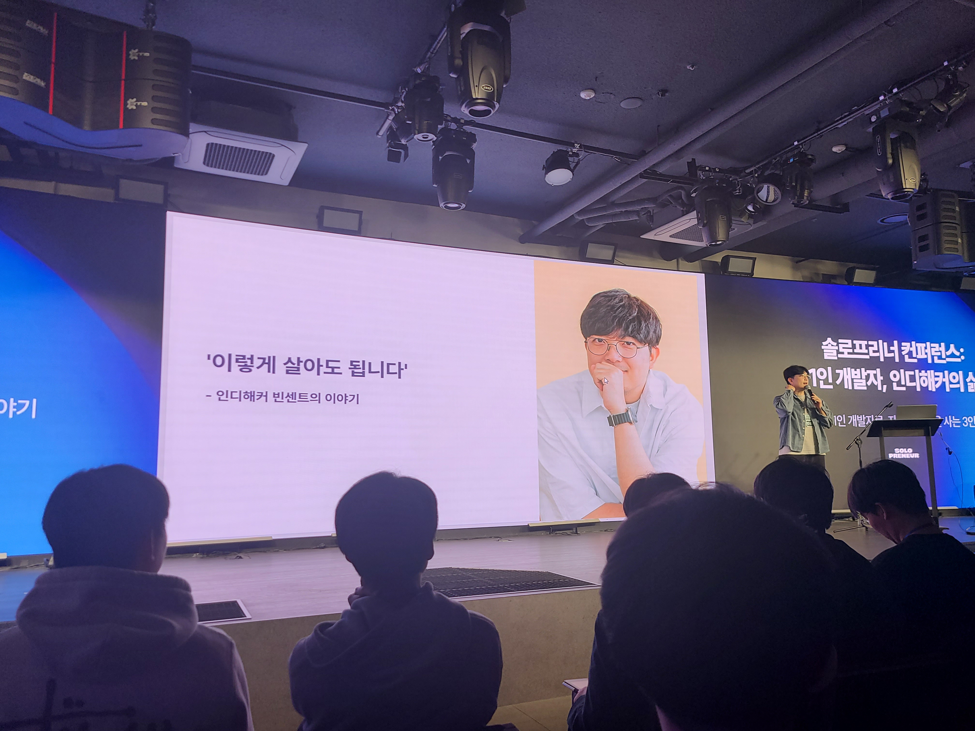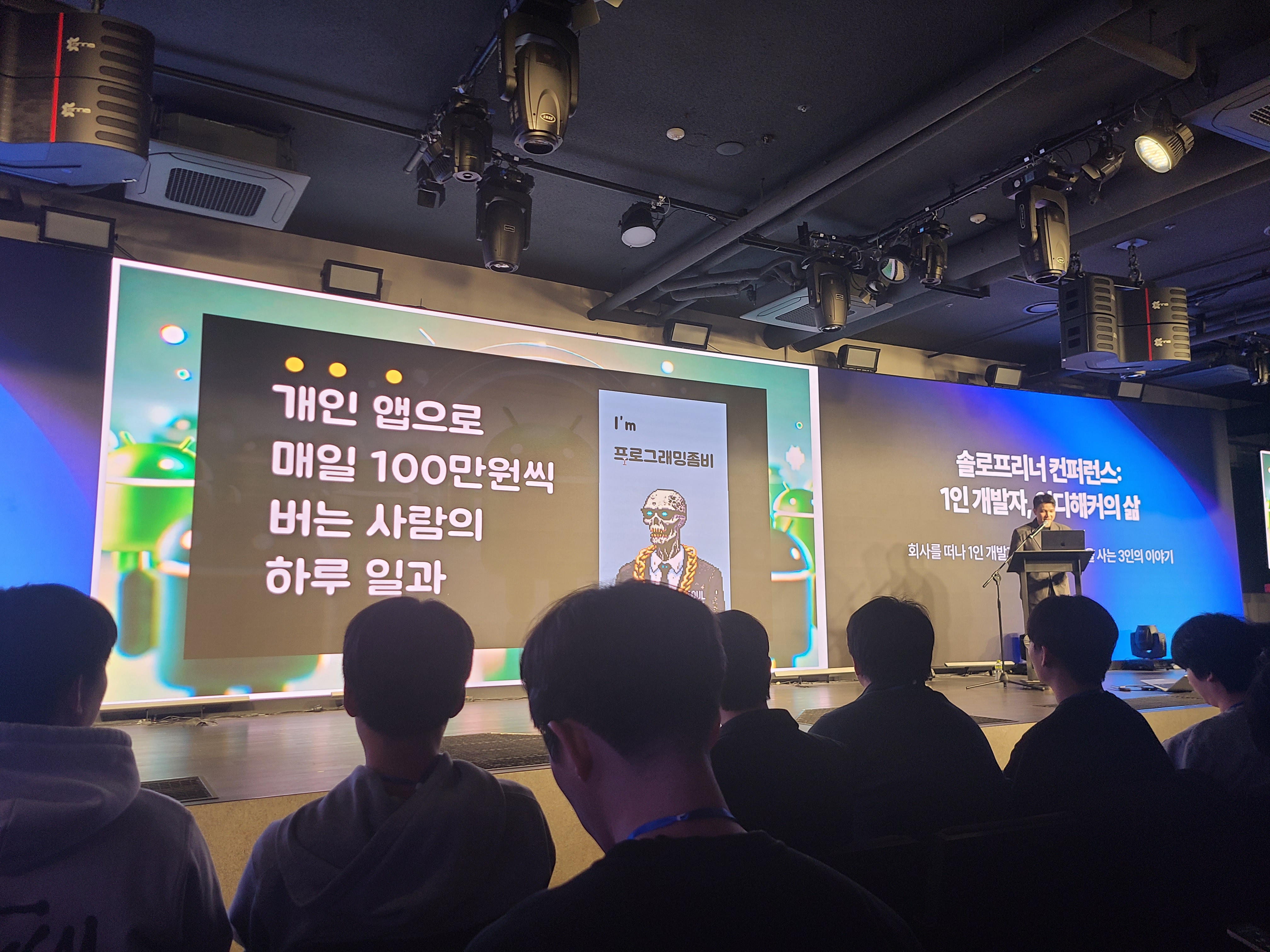 솔로프리너 컨퍼런스에서 주최한 "1인 개발자, 인디해커의 삶"이라는 강연에 다녀왔다. "커피한잔"이라는 블라인드 소개팅 앱을 만든 김재호 씨의 팬인데 (그분의 시니컬하고 솔직하게 이야기하는 자세를 좋아한다.) 김재호 씨와 프로그래밍 좀비, 빈센트 이렇게 3분이 인디해커로서의 삶을 이야기하는 강연이었다.