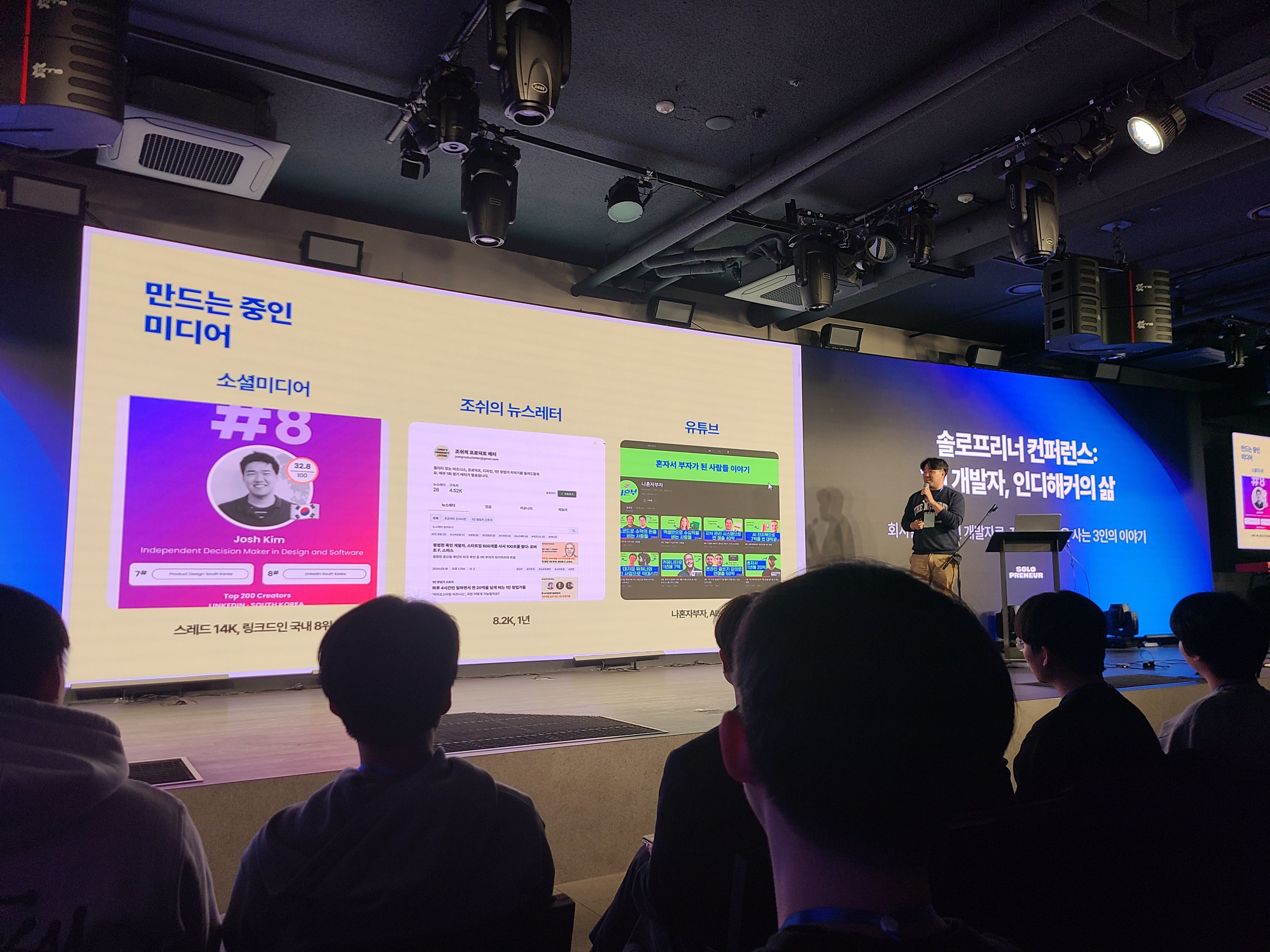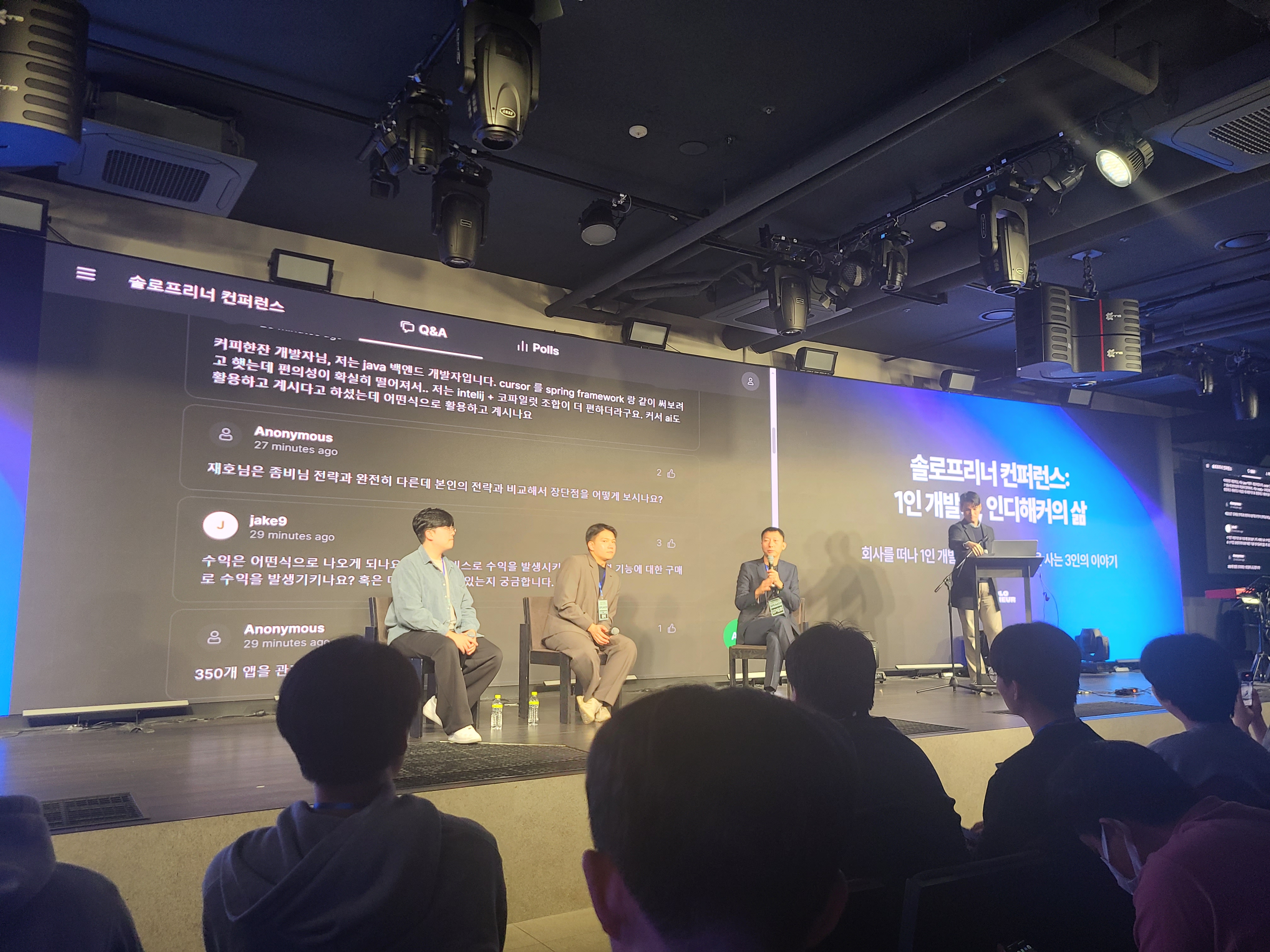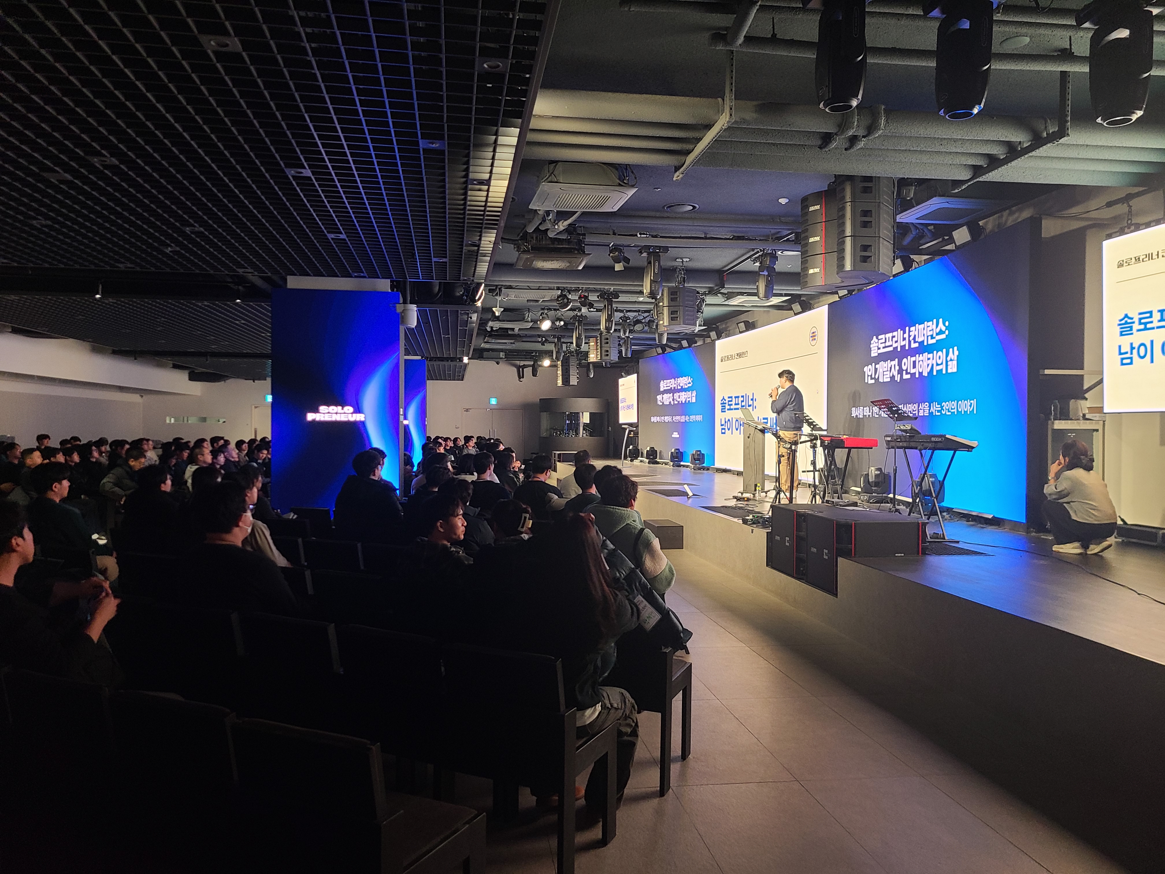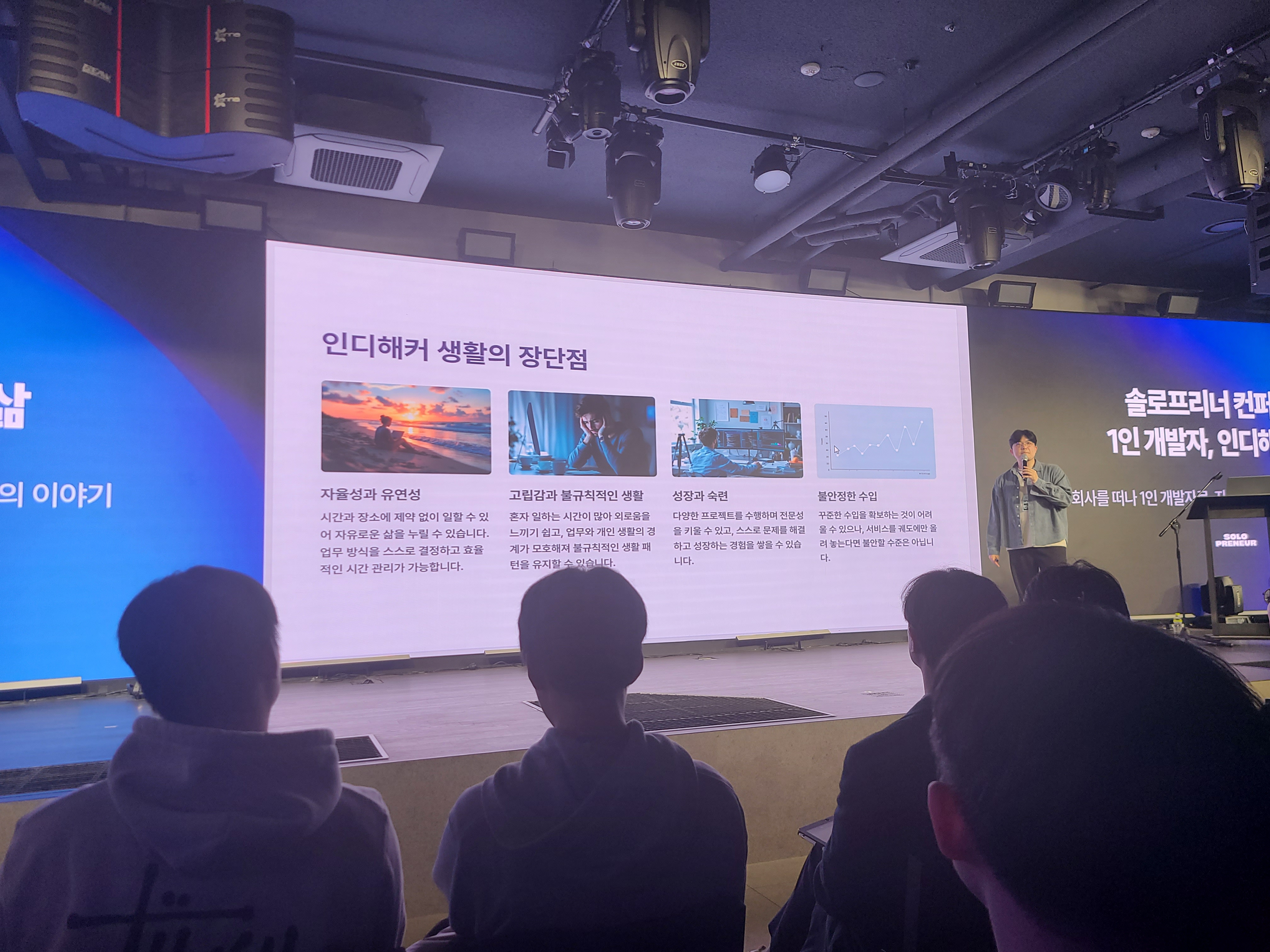 솔로프리너 컨퍼런스에서 주최한 "1인 개발자, 인디해커의 삶"이라는 강연에 다녀왔다. "커피한잔"이라는 블라인드 소개팅 앱을 만든 김재호 씨의 팬인데 (그분의 시니컬하고 솔직하게 이야기하는 자세를 좋아한다.) 김재호 씨와 프로그래밍 좀비, 빈센트 이렇게 3분이 인디해커로서의 삶을 이야기하는 강연이었다.