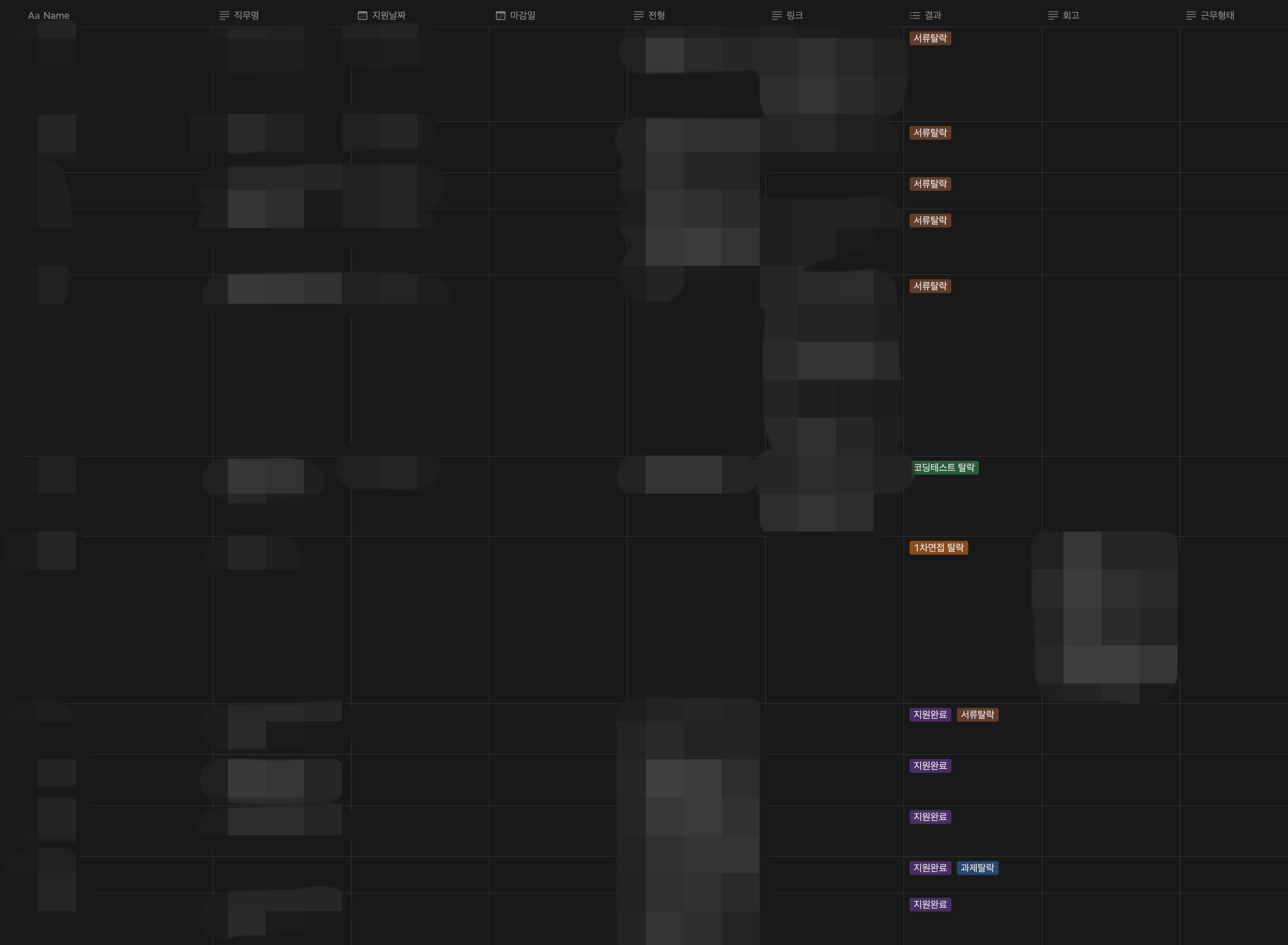 지원했던 회사는 노션으로 관리했다. 총 약 20개 정도 회사에 지원했다. 대기업, 중견기업, 스타트업 등 다양하게 지원했다. 이중에 서류 합격은 16곳, 면접은 10곳을 보았다. 코딩 테스트나 면접에서 떨어지면 멘탈을 다잡고 회고록을 적었다.
