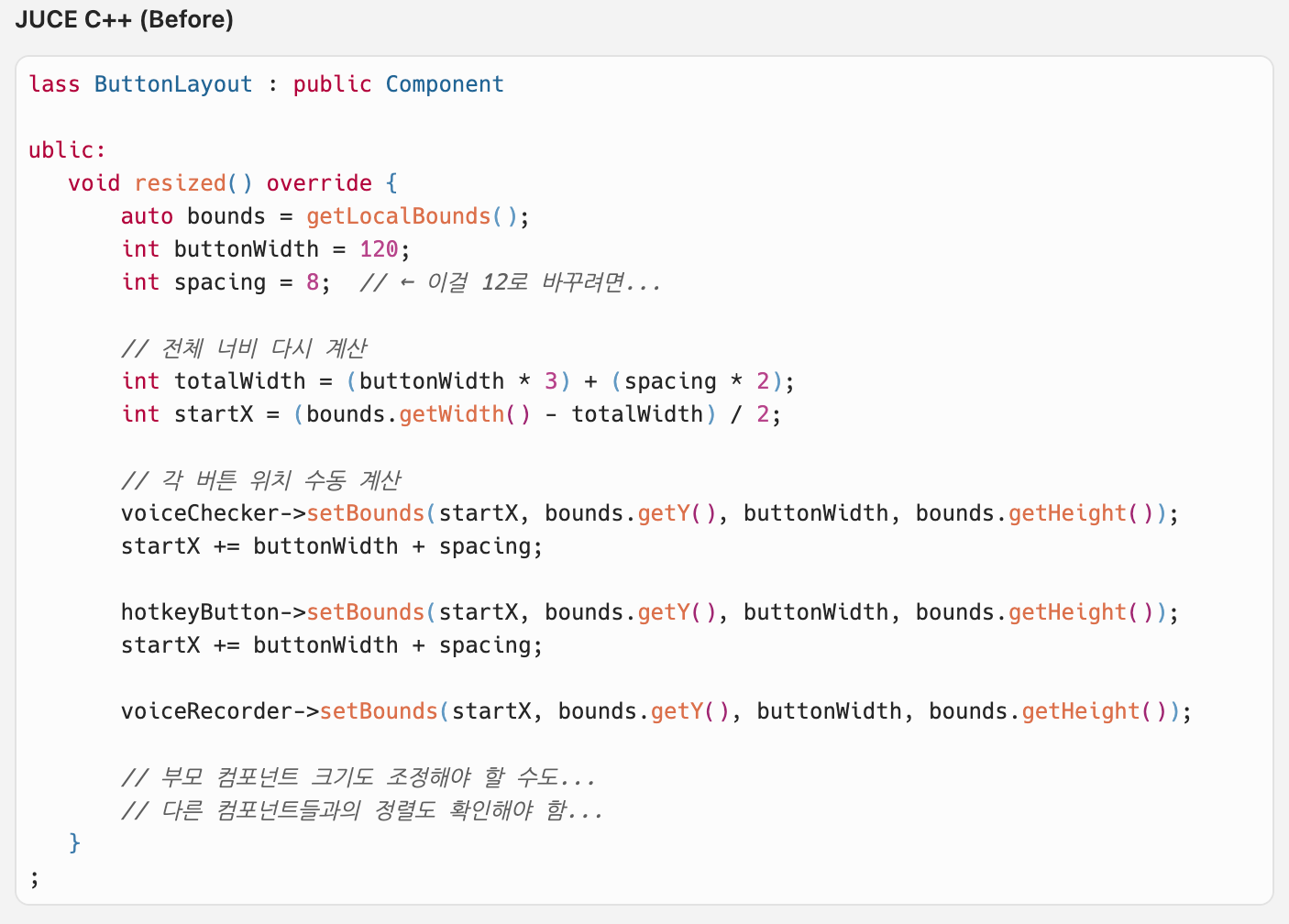 C++ 기반의 코드에서는 UI를 변경하는 게 매우 어렵습니다. 위치를 수동으로 계산해야 하고, 부모 혹은 다른 컴포넌트도 신경 써야 합니다. 한 땀 한 땀 직접 그려야 한다고 생각하시면 됩니다.