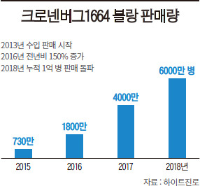 위의 그래프를 보면 알 수 있듯이 블랑의 판매량은 폭주 기관차처럼 해마다 무서운 속도로 증가했습니다. 2016년에는 드래프트 생맥주도 수입하여 팔기 시작했습니다. 2017년의 블랑 판매량은 4000만 개였는데요, 이는 본고장 프랑스를 이기고 전 세계 1위에 오른 수치라고 합니다. 참고로 그 당시 전 세계 2위는 중국, 3위가 프랑스였다고 하네요. 2018년에는 블랑의 인기에 힘입어 "크로넨버그 1664 라거"를 수입하여 이제 편의점에서도 이 맥주를 볼 수 있습니다. 그리고 2019년 2월에는 한국 누적 판매량이 무려 1억 병을 돌파하였다고 합니다.