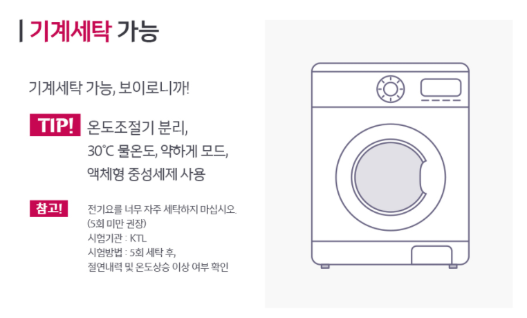 단 아무래도 전자 제품이다 보니 약하게 모드에 낮은 온도로 해야 하고 너무 자주 세탁하면 안 된다고 합니다.