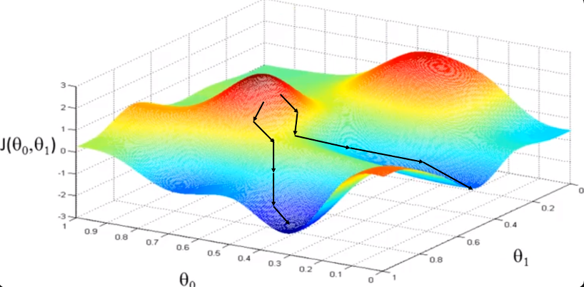 가중치가 여러 개일 때의 그래프는 위와 같습니다. 가중치 개수가 n개라면 n차원의 평면이 손실 함수가 됩니다. 가중치가 여러 개라면 각각의 w에 대해 편미분하여 극소값을 찾을 수 있겠지만 손실 함수가 최소가 되는 지점이 아니게 됩니다. 따라서 경사하강법을 사용해야 local minimum 값을 찾을 수 있습니다.