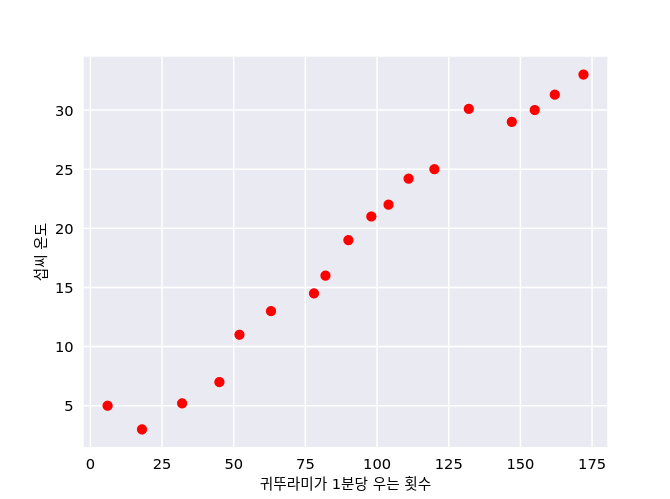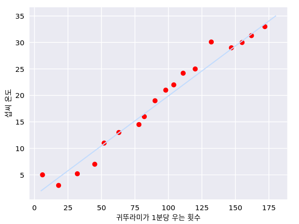 그래프를 만들고나면 섭씨 온도와 귀뚜라미가 1분당 우는 횟수가 선형 관계임을 알 수 있습니다.
