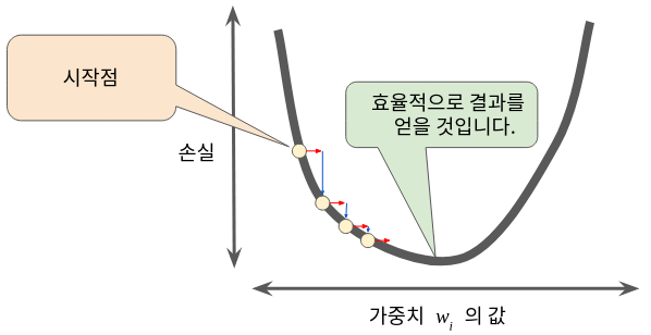 손실을 줄이는 방향으로 매개 변수(가중치와 편향)를 어떻게 변경할 수 있을까요? 경사하강법을 사용할 수 있습니다.