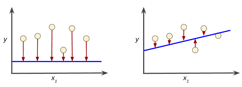 빨간색 화살표는 손실, 파란색 직선은 예측을 나타냅니다. 위의 예시에서 손실은 왼쪽 모델이 더 크기 때문에 오른쪽 모델이 더 예측을 잘하는 모델입니다.