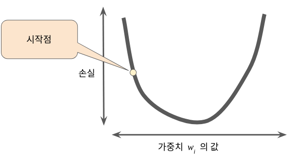 임의의 시작점을 잡습니다(w값을 임의로 정합니다). 우리는 손실 함수의 시작점에서 편미분 값을 알 수 있습니다.