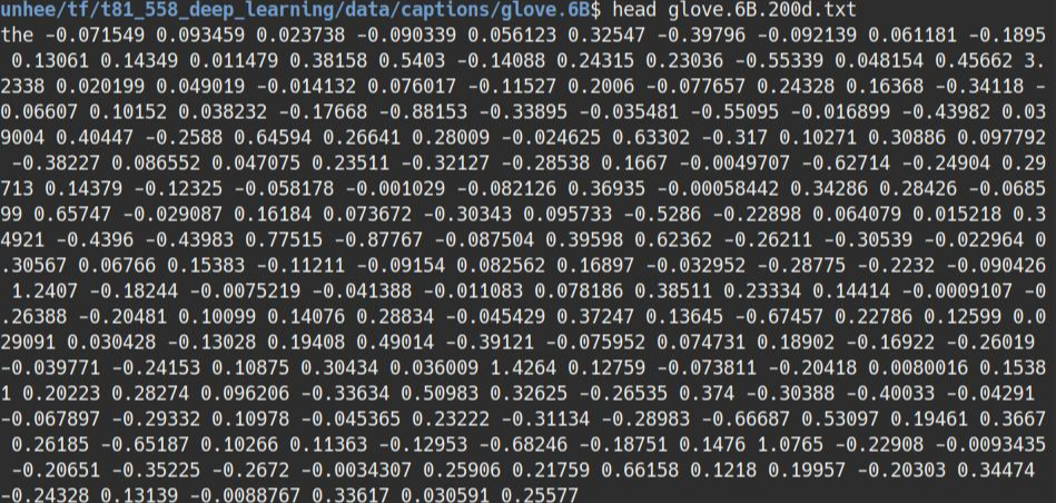 Glove 임베딩에서 the를 열어보니 하나의 단어를 200개의 숫자로 표현한 걸 알 수 있네요.