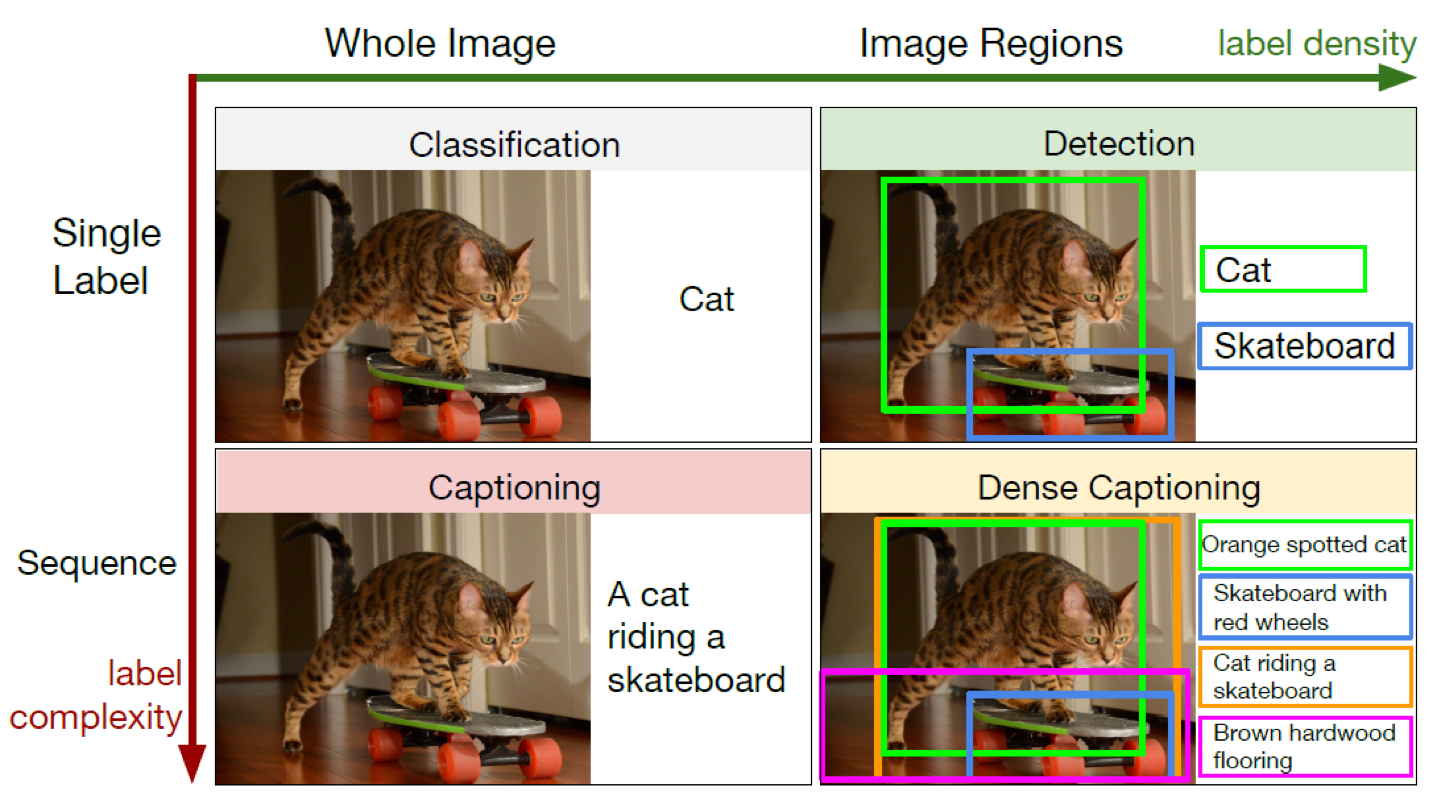 이미지 캡셔닝은 분류(Classification)와 비슷한데요, label density와 label complexity로 Classification, Detection, Captioning, Dense Captioning으로 나눌 수 있습니다. 저희는 이중에 Captioning을 알아보고 있고요.