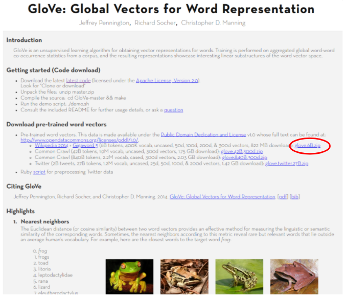 Glove 워드 임베딩도 pre-trained 된 워드 벡터(유사도를 이용해 단어를 벡터로 표현한 것)를 받아서 사용합니다.