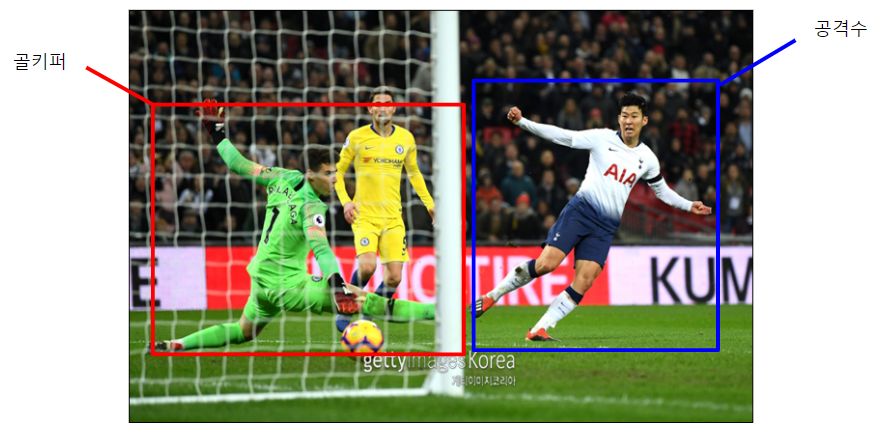 예를 들어 위의 사진에서 골키퍼, 공격수, 골대, 축구공, 손흥민(?)을 찾아내서