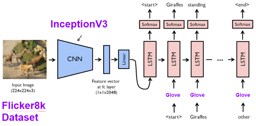 예제에서는 Flicker8K 데이터셋, CNN은 InceptionV3, RNN은 LSTM, 워드 임베딩은 Glove를 사용합니다.