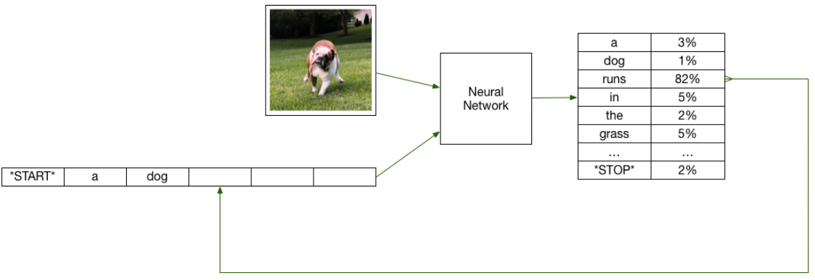위의 예시를 보시면, (강아지 사진 + a dog)가 Neural Network의 Input으로 들어오면 runs일 확률이 가장 높기 때문에 runs 라는 단어를 추가하여 a dog runs 라는 문장을 만들게 됩니다.
