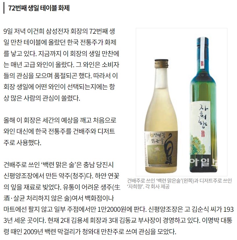 백련 맑은 술은 이건희 회장이 74세의 생일상에 마셨던 술로 유명해졌다고 해요!