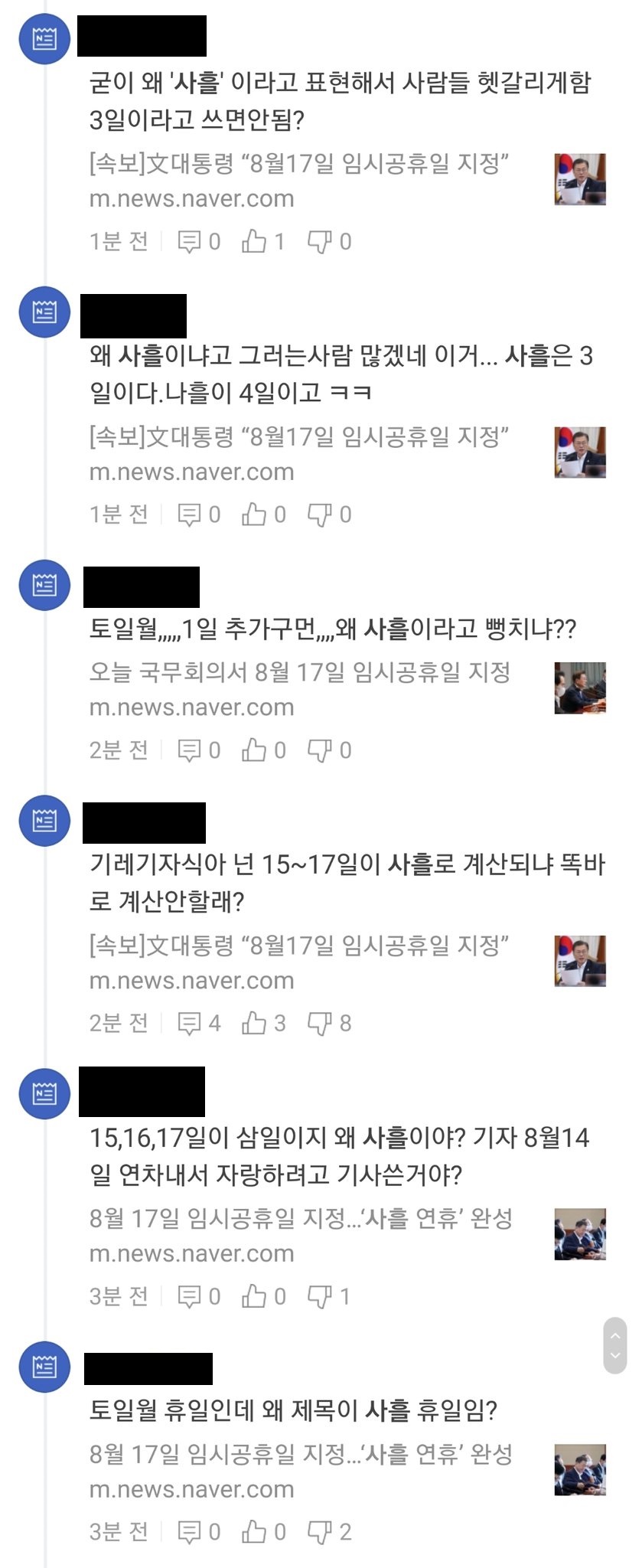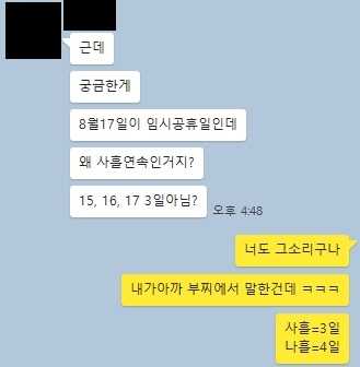 뉴스 기사를 보다가 8월 17일 월요일 쉬면 금토일 3일 쉬는데 왜 나흘이지?라고 잠깐 생각했습니다.