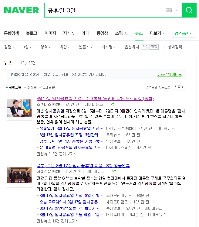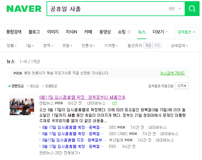 검색 기간을 1일로 잡고 "공휴일 사흘"이라고 뉴스 기사를 검색하면 총 175건이 나옵니다.