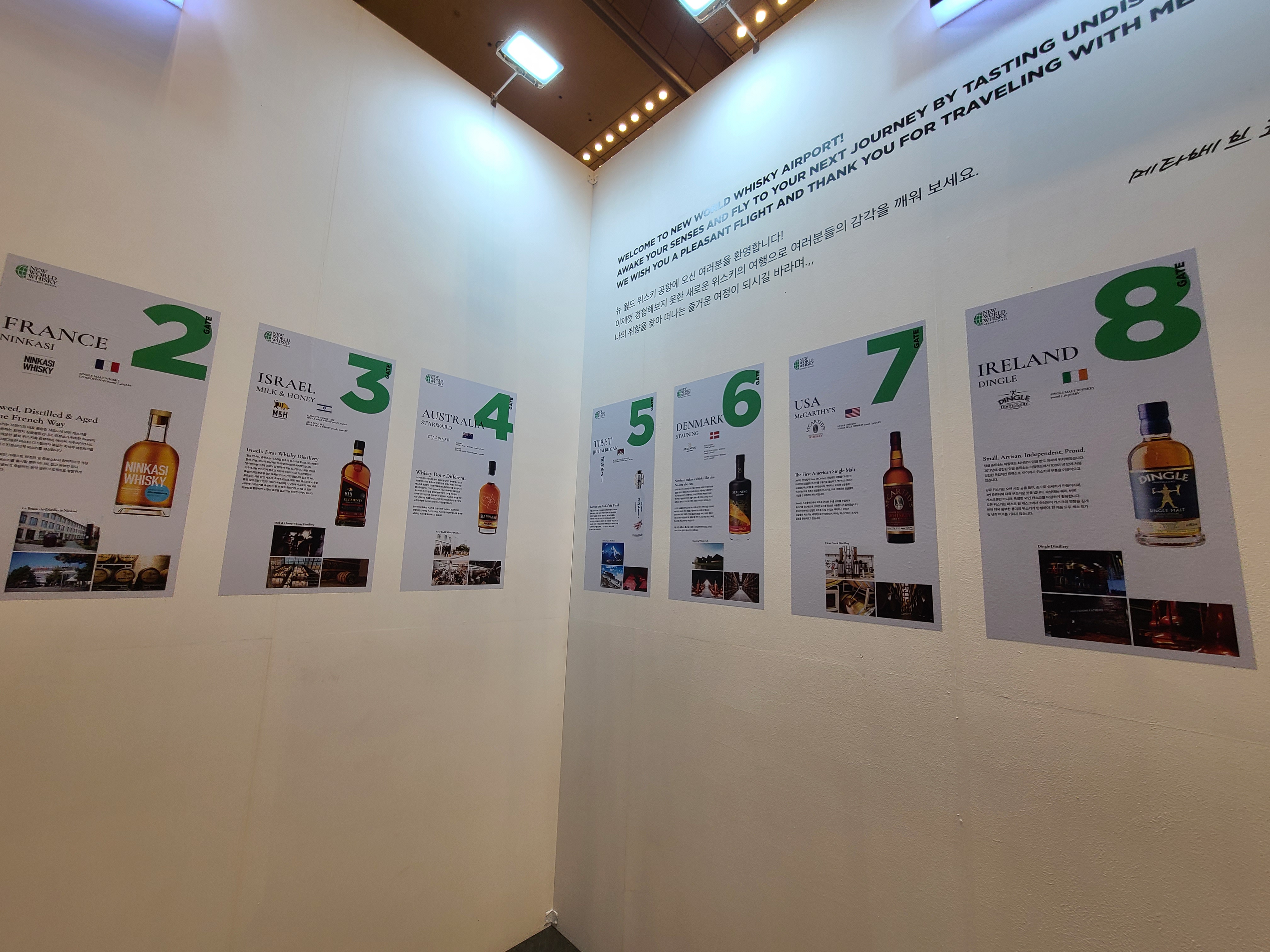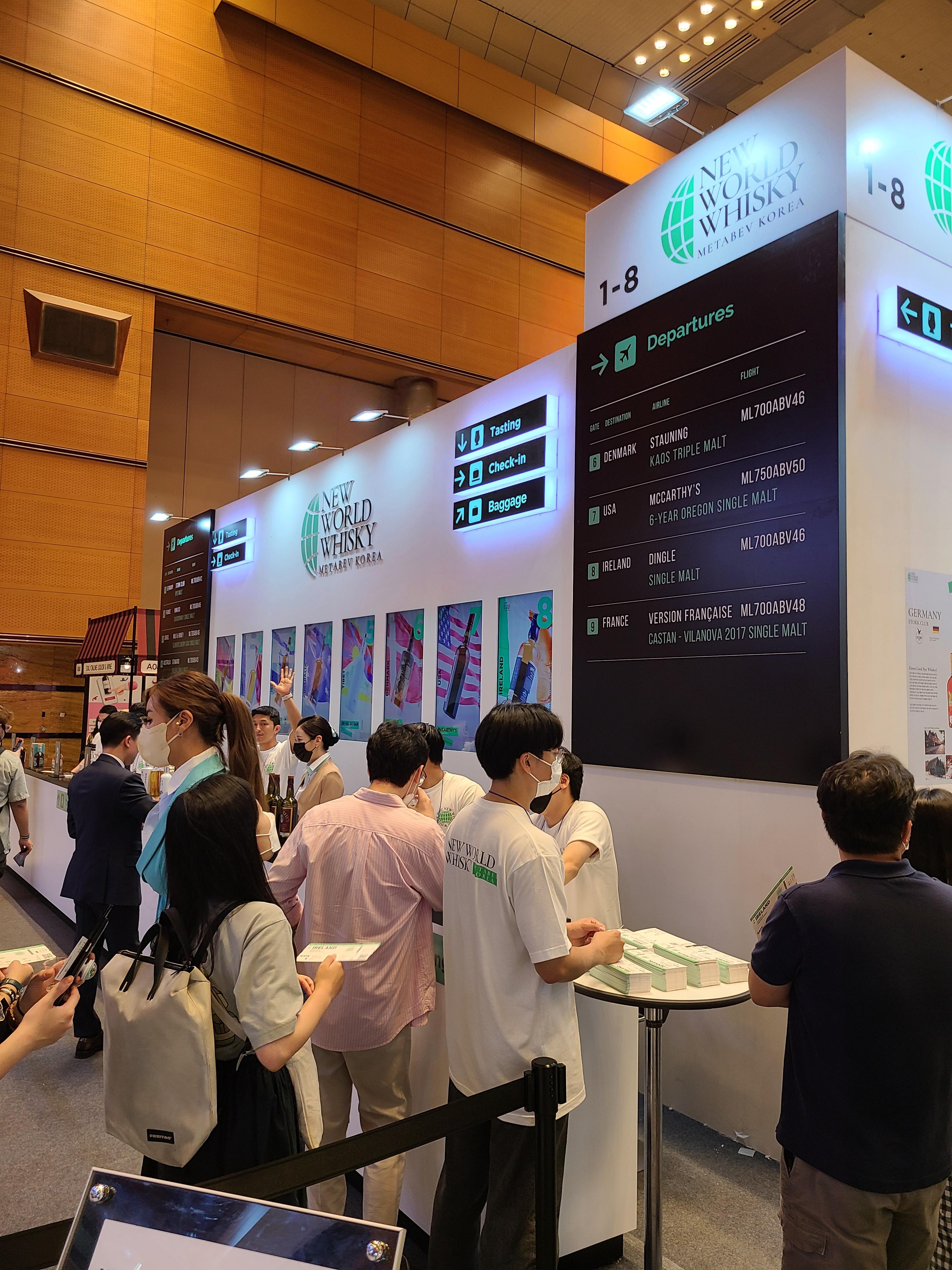메타베브코리아는 위스키 생산 국가로 해외 여행을 가는 컨셉의 부스를 기획했다. 승무원 복을 입으신 분의 안내를 받아 가고 싶은 나라의 티켓을 골라 시음을 하고 설명을 들을 수 있었다.