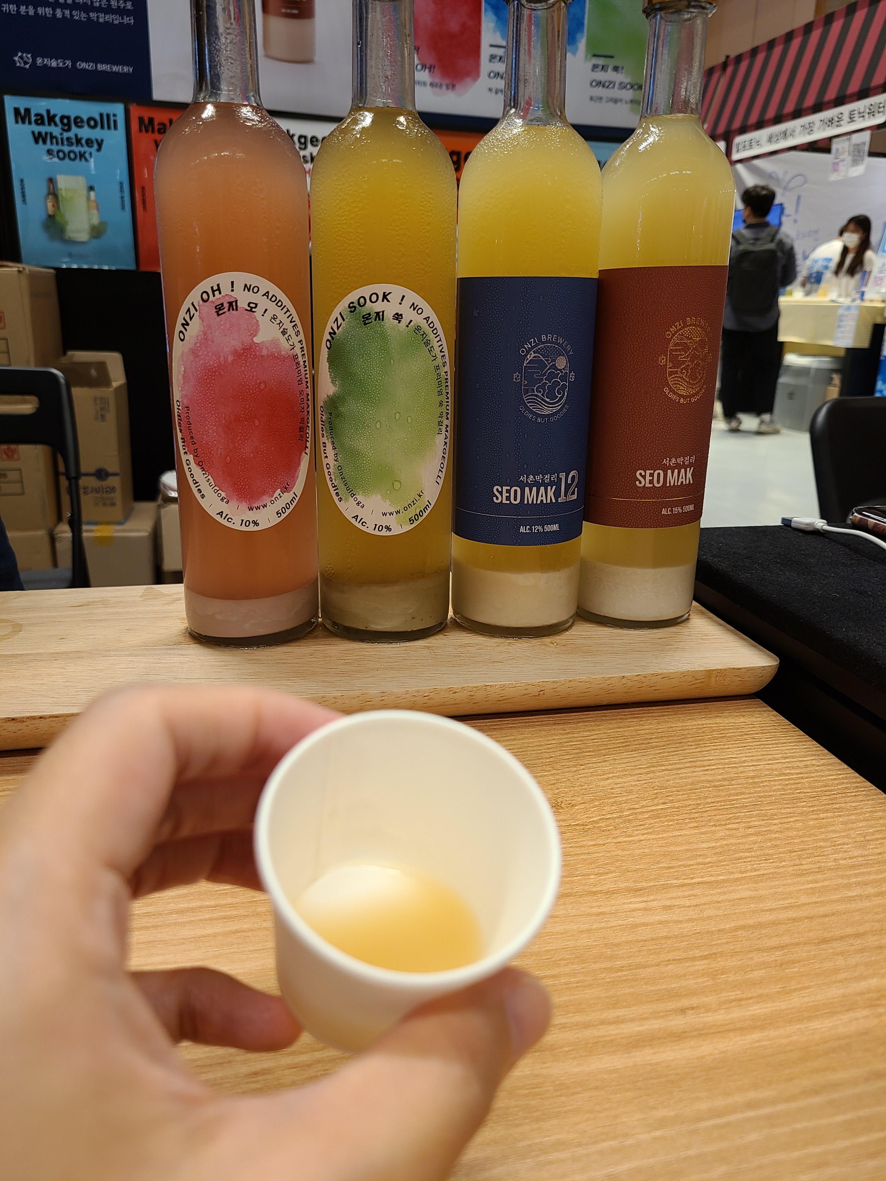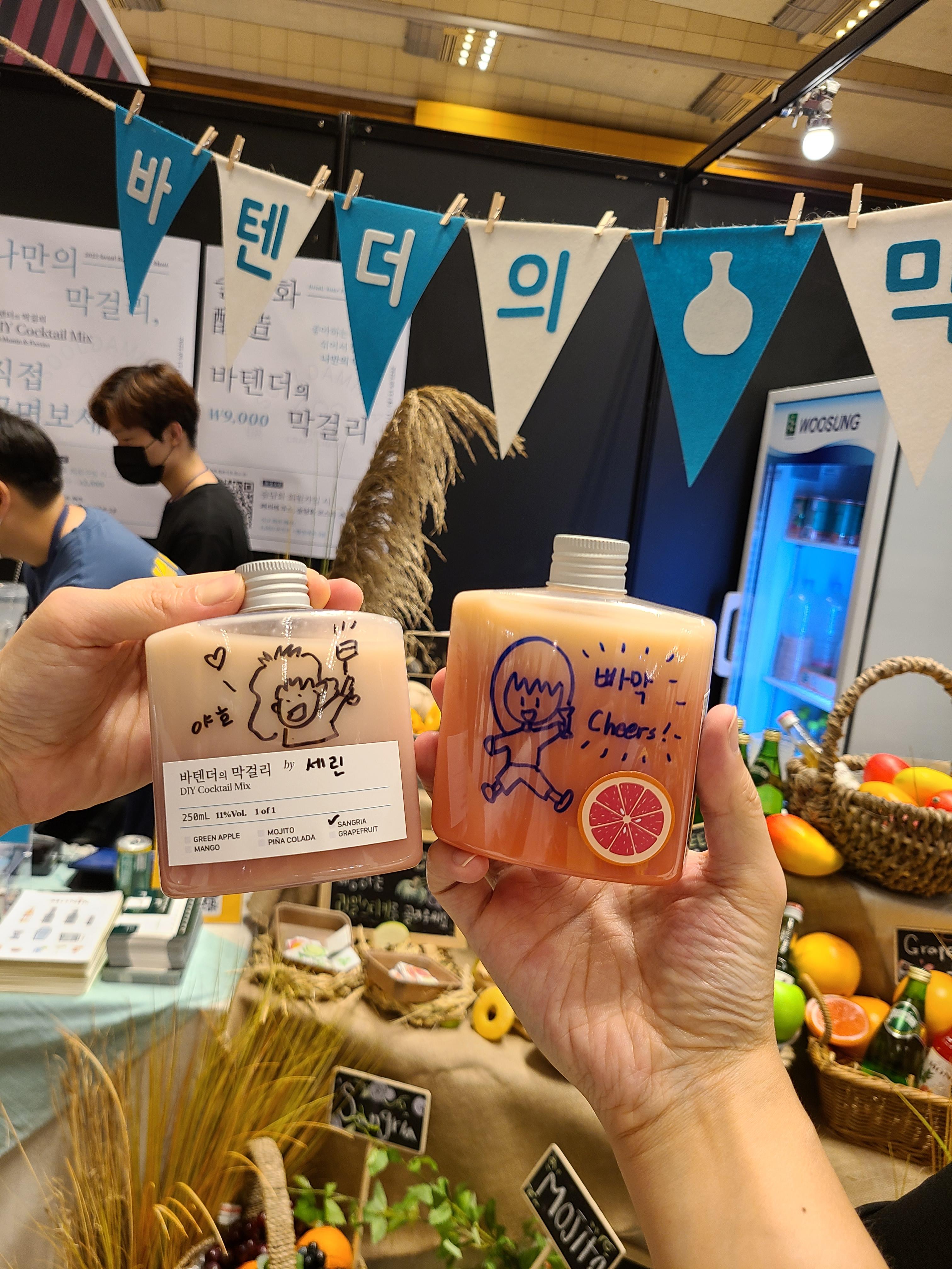 맥주, 전통주, 사케는 주류박람회보다 규모는 작았지만 알찬 부스들이 많았다. 가장 특이했던건 술담화의 칵테일 전용 ‘바텐더의 막걸리’ 였다. 시음을 해서 가장 마음에 드는 시럽을 골라 막걸리 칵테일을 만드는 것 뿐만 아니라 막걸리 병도 스티커와 마커로 꾸밀 수 있었다.